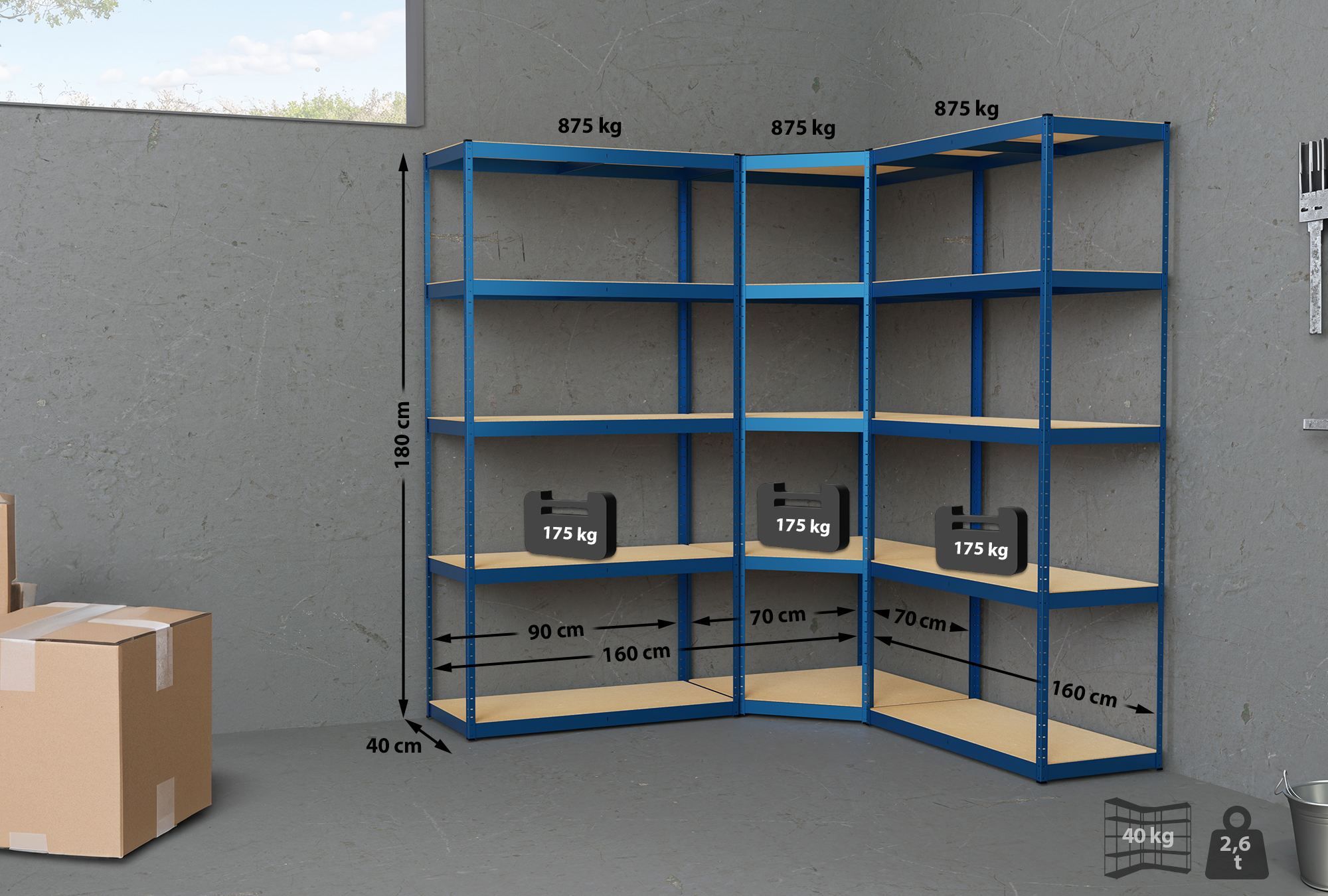 Tento trojdielny policový systém je ideálny na skladovanie ťažkých predmetov. Tento policový systém pozostáva z dvoch identických políc a jednej rohovej police a je vhodný najmä do obdĺžnikových skladovacích priestorov. Táto sada políc je ideálna do pivníc, dielní, skladov a garáží.