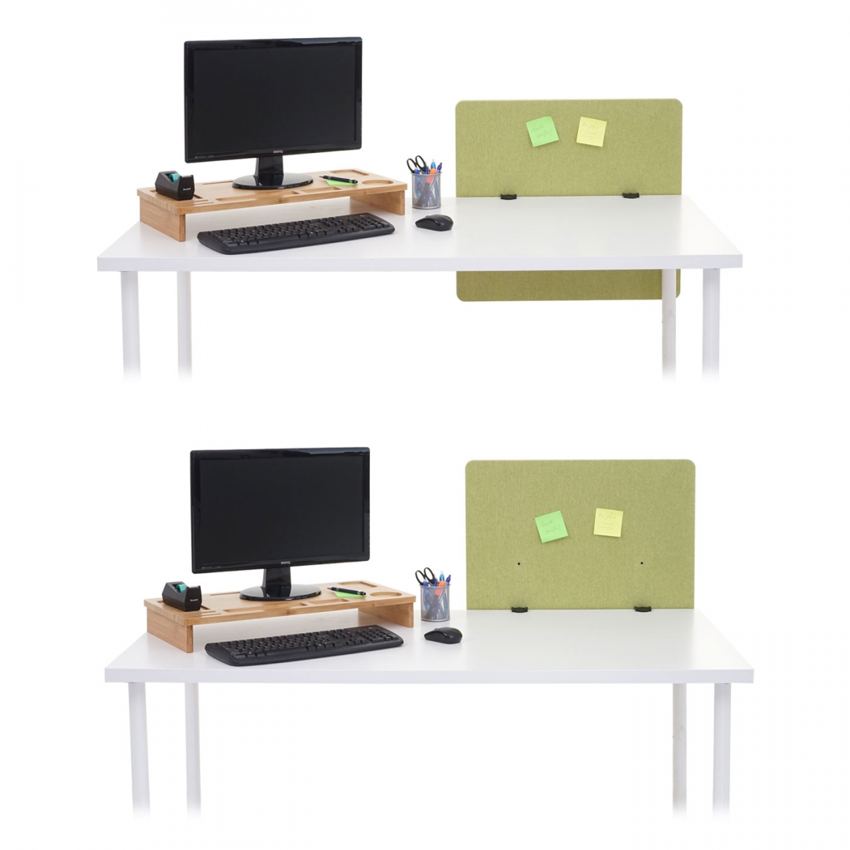 Jednoduchá a rýchla montáž: Všetko, čo musíte urobiť, je namontovať priložené stolové svorky na priečku pomocou skrutiek a potom ich pripevniť k stolu pomocou hviezdicovej skrutky. Vďaka individuálnemu skrutkovému systému je možné oddeľovač stola pripevniť na takmer akýkoľvek stôl. Poznámka: Pre pevné uchytenie musia byť skrutky dlhé 2,5 cm.