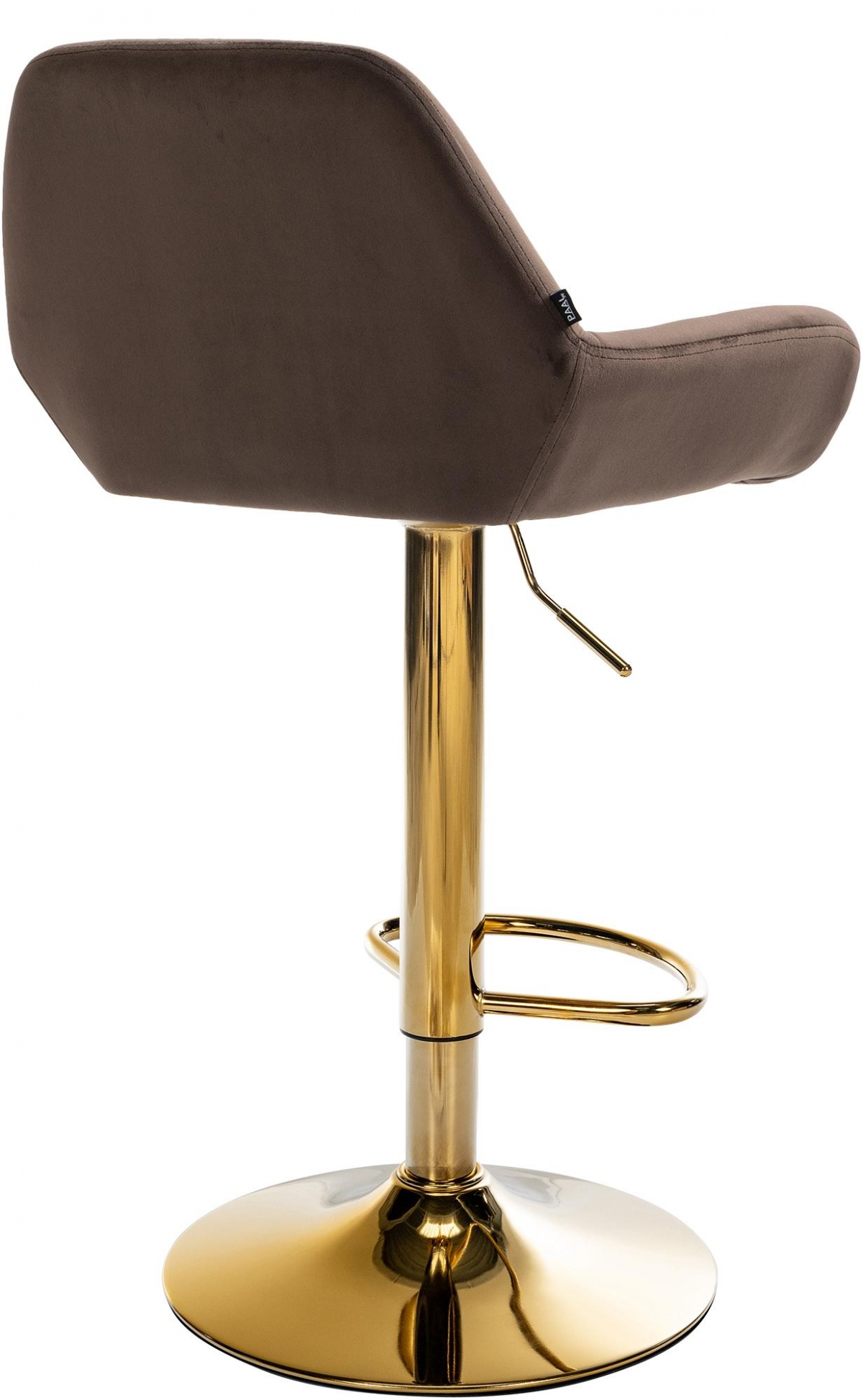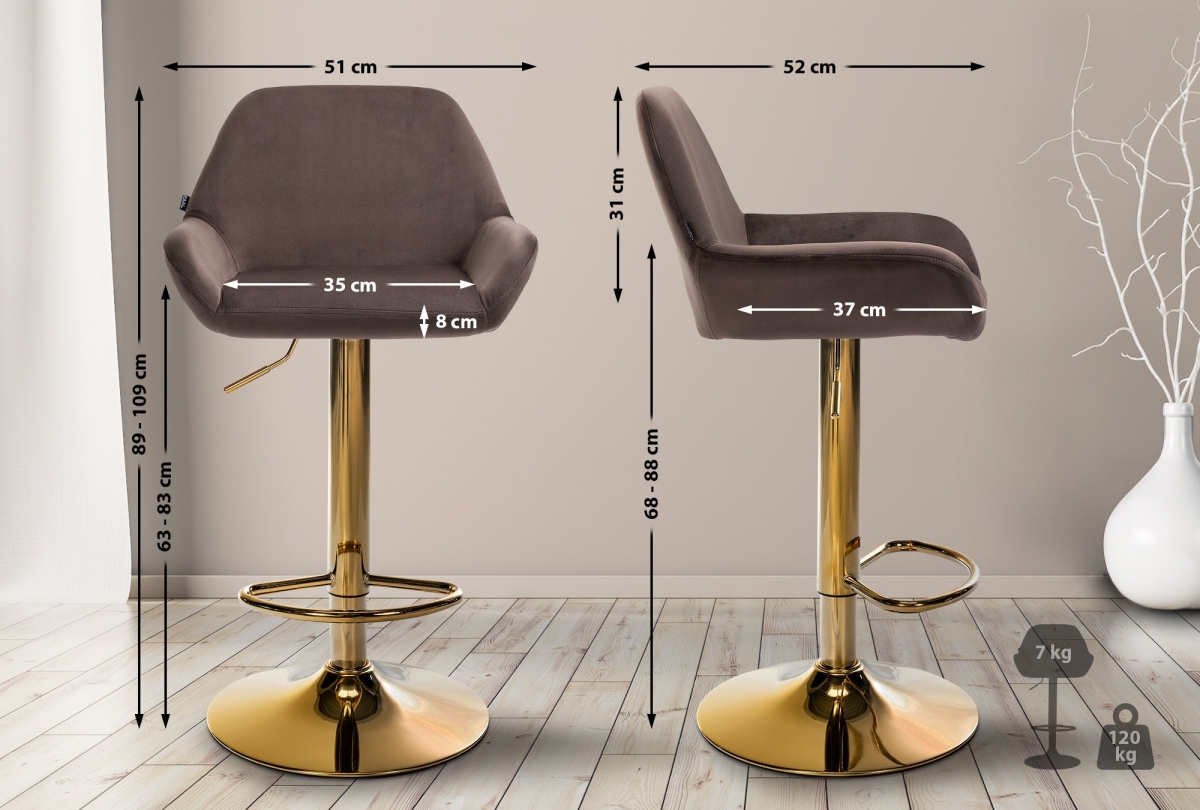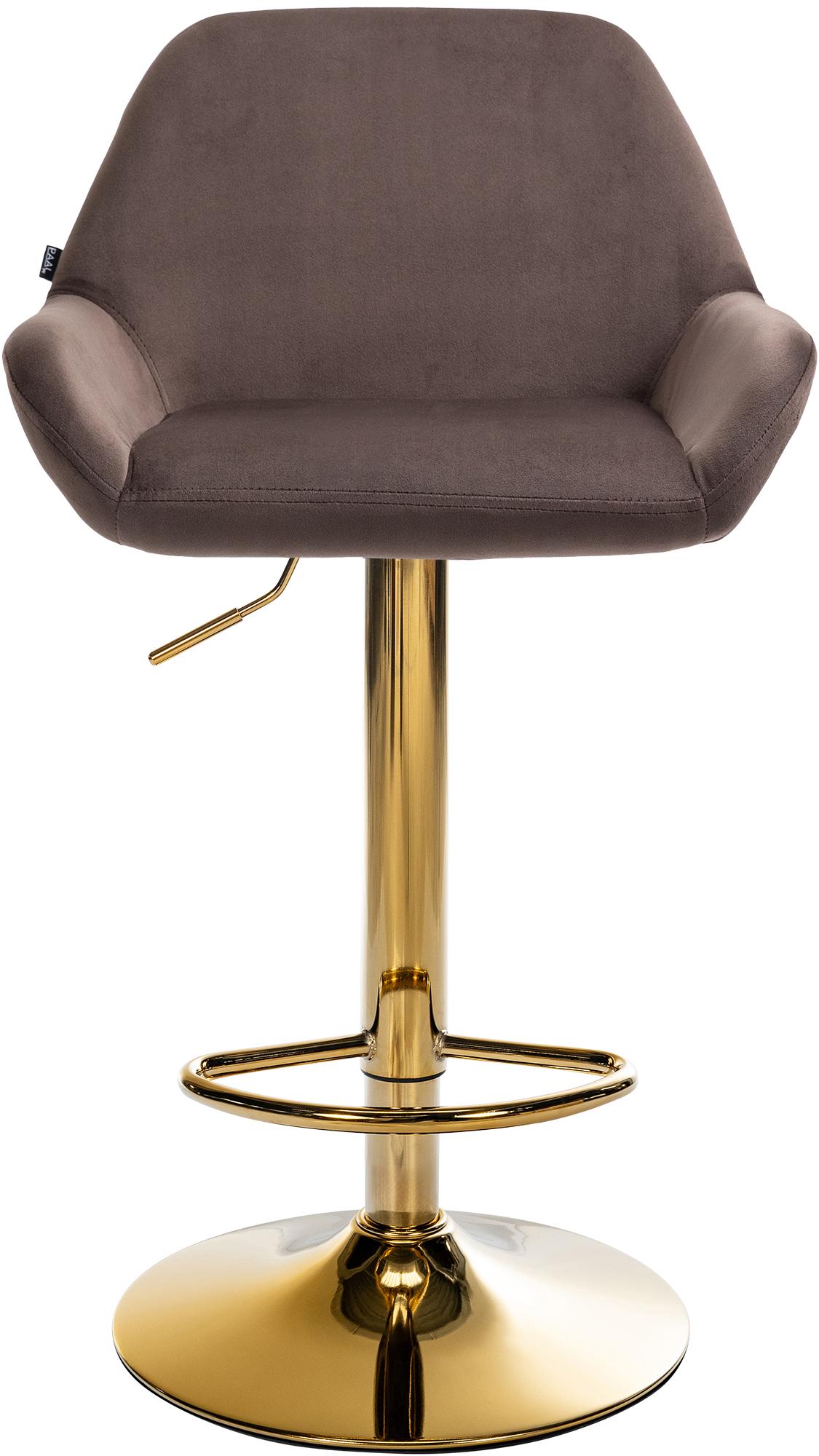 Elegantná barová stolička s otočným čalúneným sedadlom a nastaviteľnou výškou. Kovový rám so zlatým vzhľadom a poťah z umelého zamatu dodávajú nadčasový dizajn. Ideálna do moderného interiéru alebo domáceho baru.