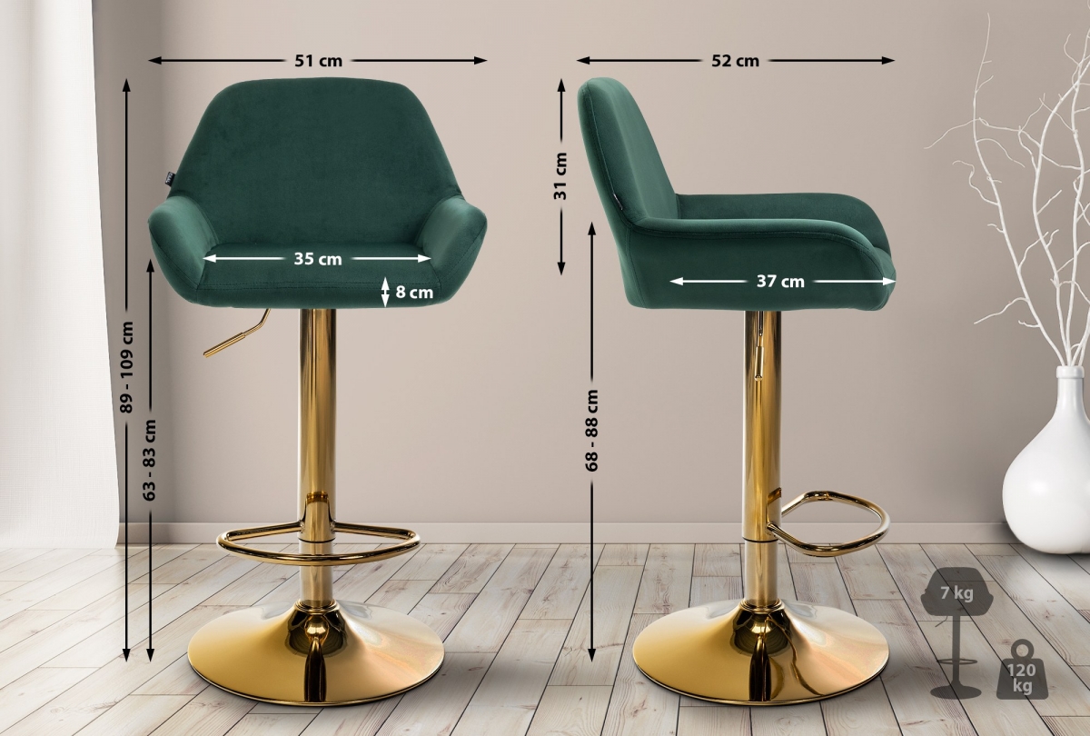 Elegantná barová stolička s otočným čalúneným sedadlom a nastaviteľnou výškou. Kovový rám so zlatým vzhľadom a poťah z umelého zamatu dodávajú nadčasový dizajn. Ideálna do moderného interiéru alebo domáceho baru.