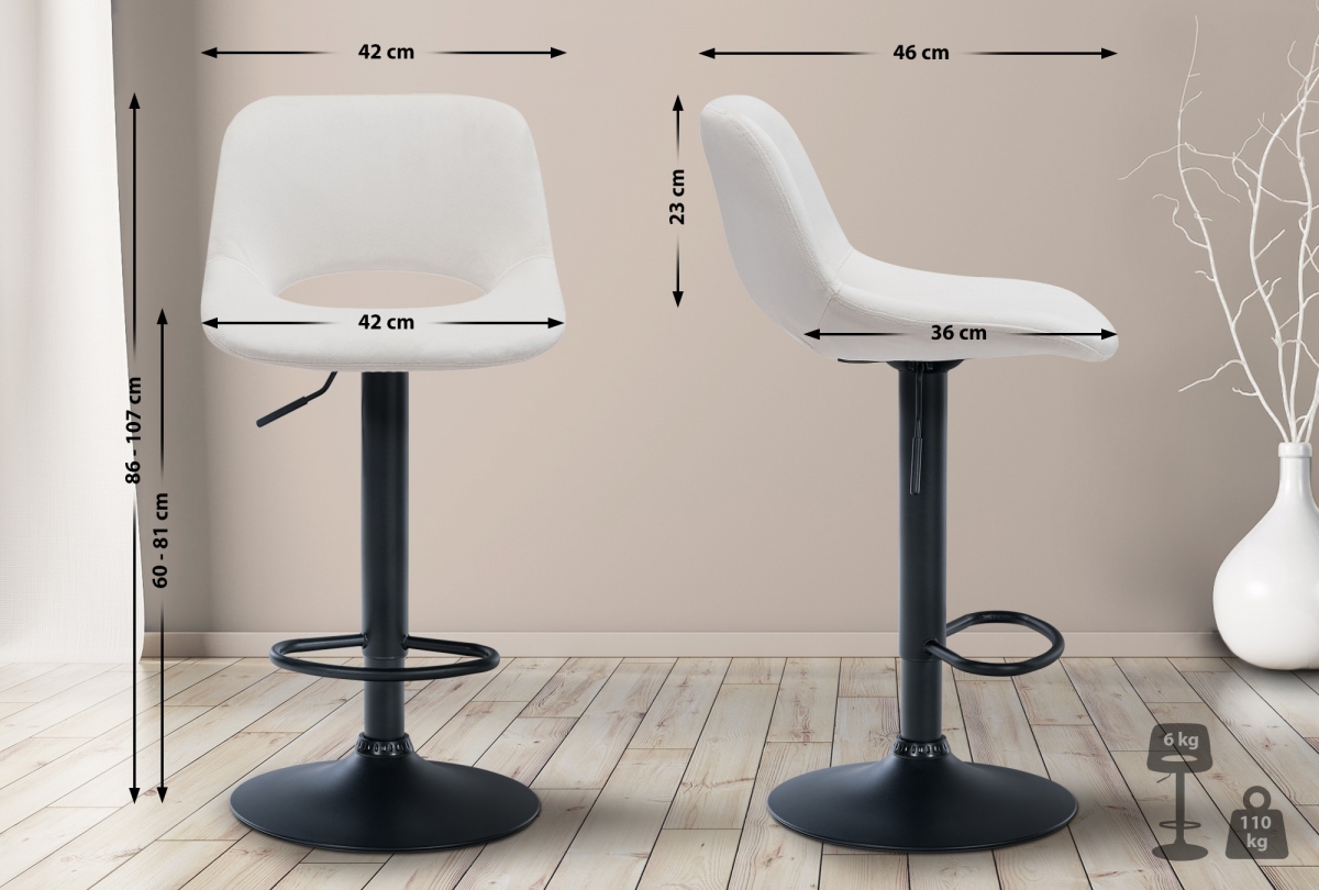 Integrované opierky nôh ponúkajú dodatočný komfort sedenia. Nakoniec sú barové stoličky vybavené chráničmi podlahy, aby boli chránené aj citlivé povrchy.