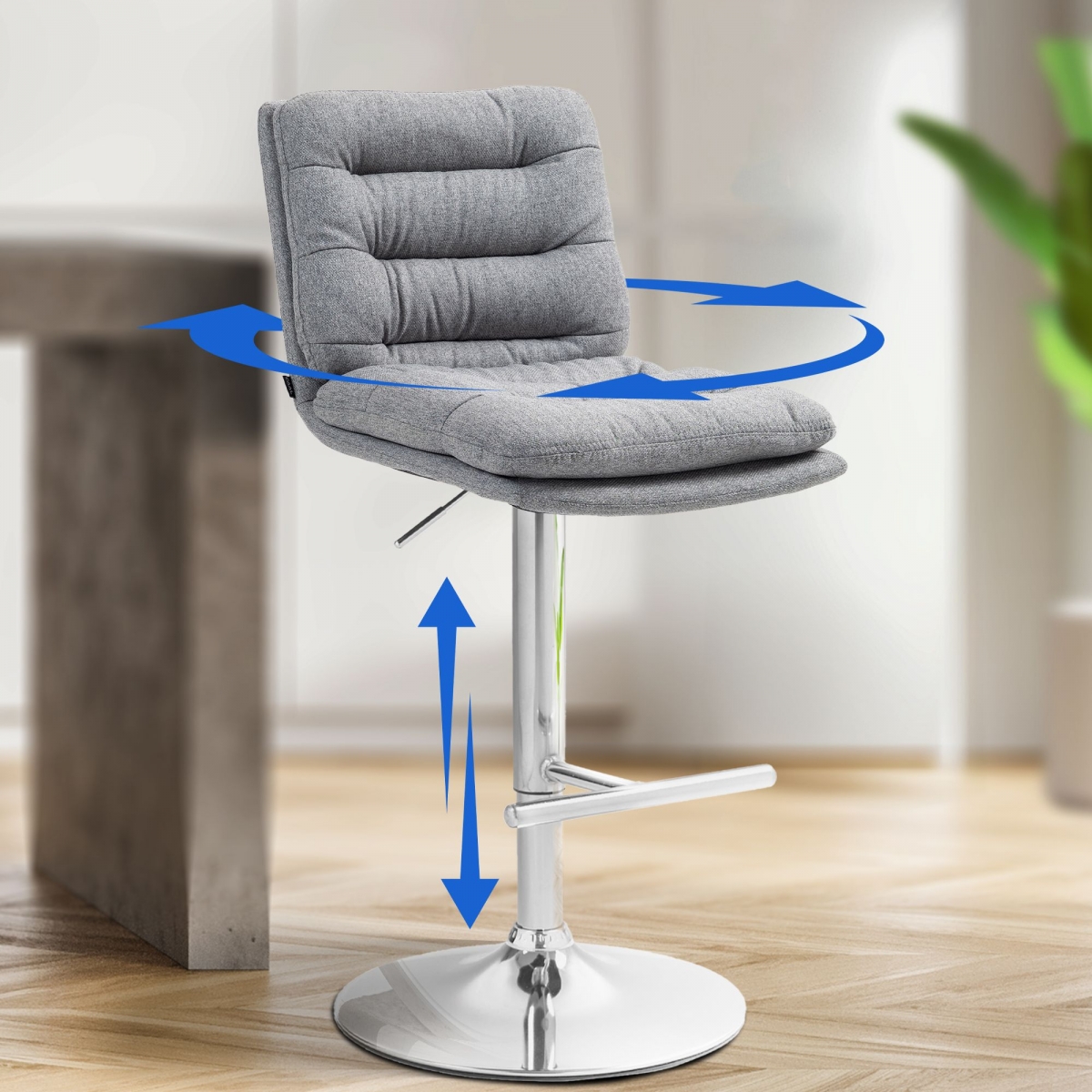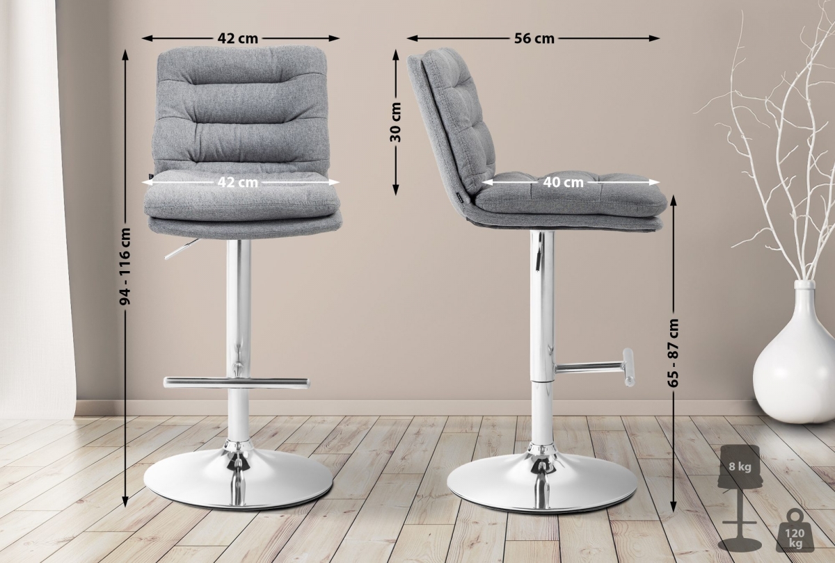 Látkový poťah na barovú stoličku Damar zaujme moderným dizajnom a vysokým komfortom. Hrubo polstrované sedadlo, nastaviteľná výška a otočná funkcia poskytujú maximálne pohodlie. Kovový rám s nosnosťou 120 kg a chrániče podlahy zaručujú stabilitu a bezpečnosť.