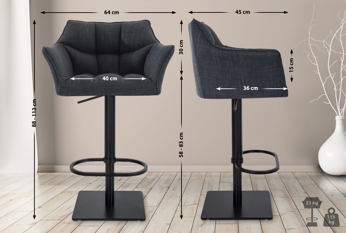 Trendy barová stolička s čiernym rámom a pohodlným čalúneným sedadlom. Moderný dizajn s praktickými podrúčkami, otáčaním a nastaviteľnou výškou sedadla 58-83 cm pre maximálny komfort pri posedení.