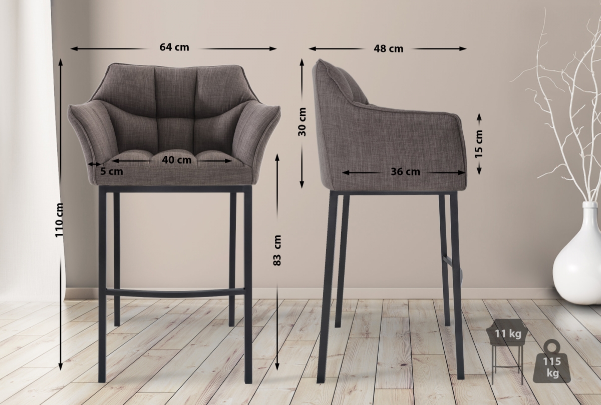 Moderná barová stolička s čiernou 4-nohou základňou ponúka vysoký komfort vďaka čalúnenému sedáku a operadlu. Praktické podrúčky a opierky nôh zaisťujú správne držanie tela. Štýlový dizajn a kvalitné materiály pre váš interiér.
