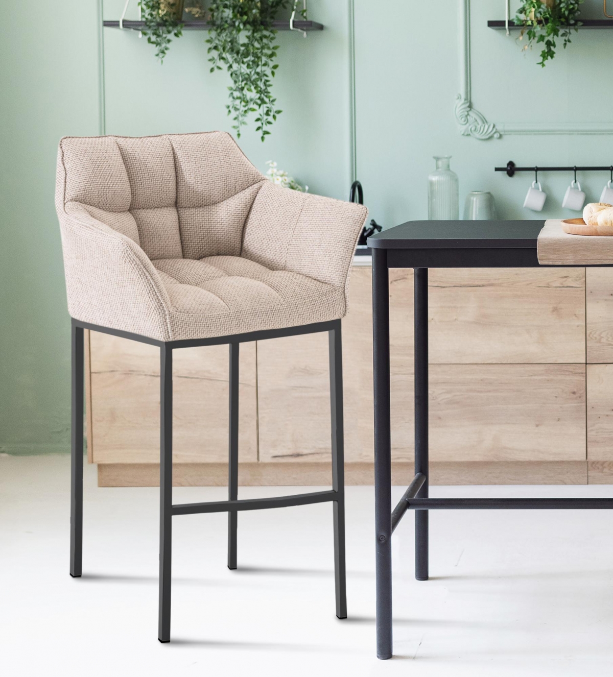 Moderná barová stolička s čiernou 4-nohou základňou ponúka vysoký komfort vďaka čalúnenému sedáku a operadlu. Praktické podrúčky a opierky nôh zaisťujú správne držanie tela. Štýlový dizajn a kvalitné materiály pre váš interiér.