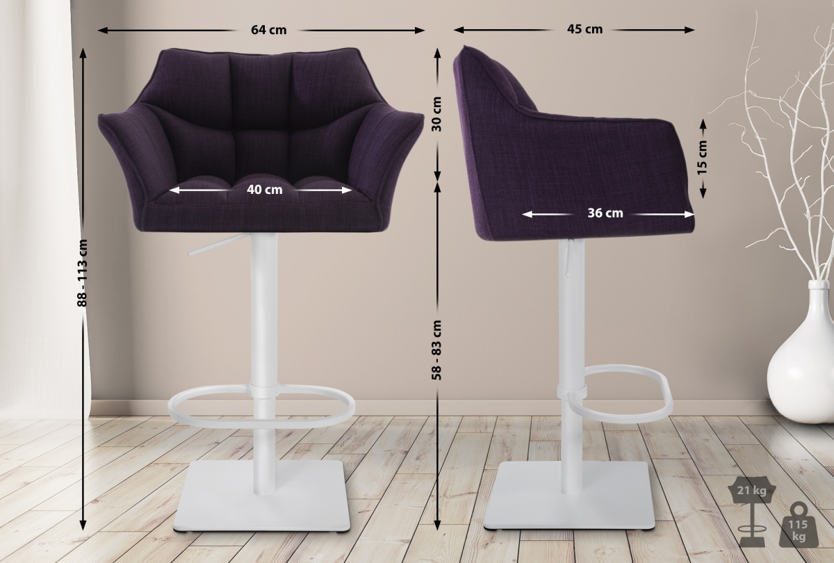 Trendy barová stolička s bielym rámom a pohodlným čalúneným sedadlom. Ponúka moderný dizajn, praktické podrúčky, otáčanie a nastaviteľnú výšku pre maximálny komfort v domácom bare alebo kuchyni.
