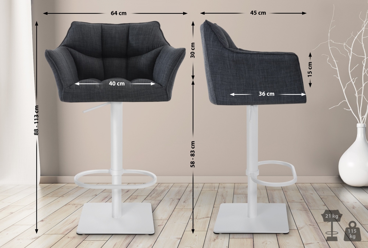 Trendy barová stolička s bielym rámom a pohodlným čalúneným sedadlom. Ponúka moderný dizajn, praktické podrúčky, otáčanie a nastaviteľnú výšku pre maximálny komfort v domácom bare alebo kuchyni.