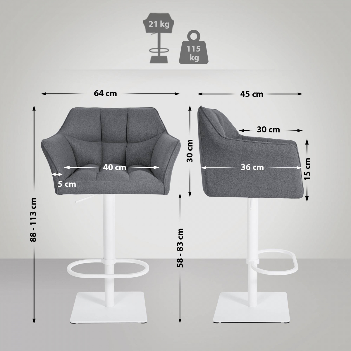 Elegantná barová stolička Damaso s nastaviteľnou výškou a otáčaním o 360°. Ponúka maximálne pohodlie vďaka polstrovanému poťahu, opierke nôh a rámu z nehrdzavejúcej ocele. Ideálna pre bary, kuchynské linky a salóniky.