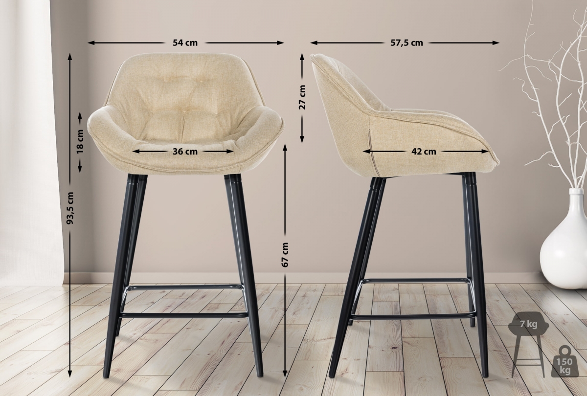Moderná barová stolička Gibson s elegantným dizajnom a pohodlným látkovým poťahom. Ponúka mäkko polstrované sedadlo, operadlo pre oporu chrbta a praktickú opierku nôh. Pevný kovový rám s nosnosťou 150 kg zaručuje stabilitu.