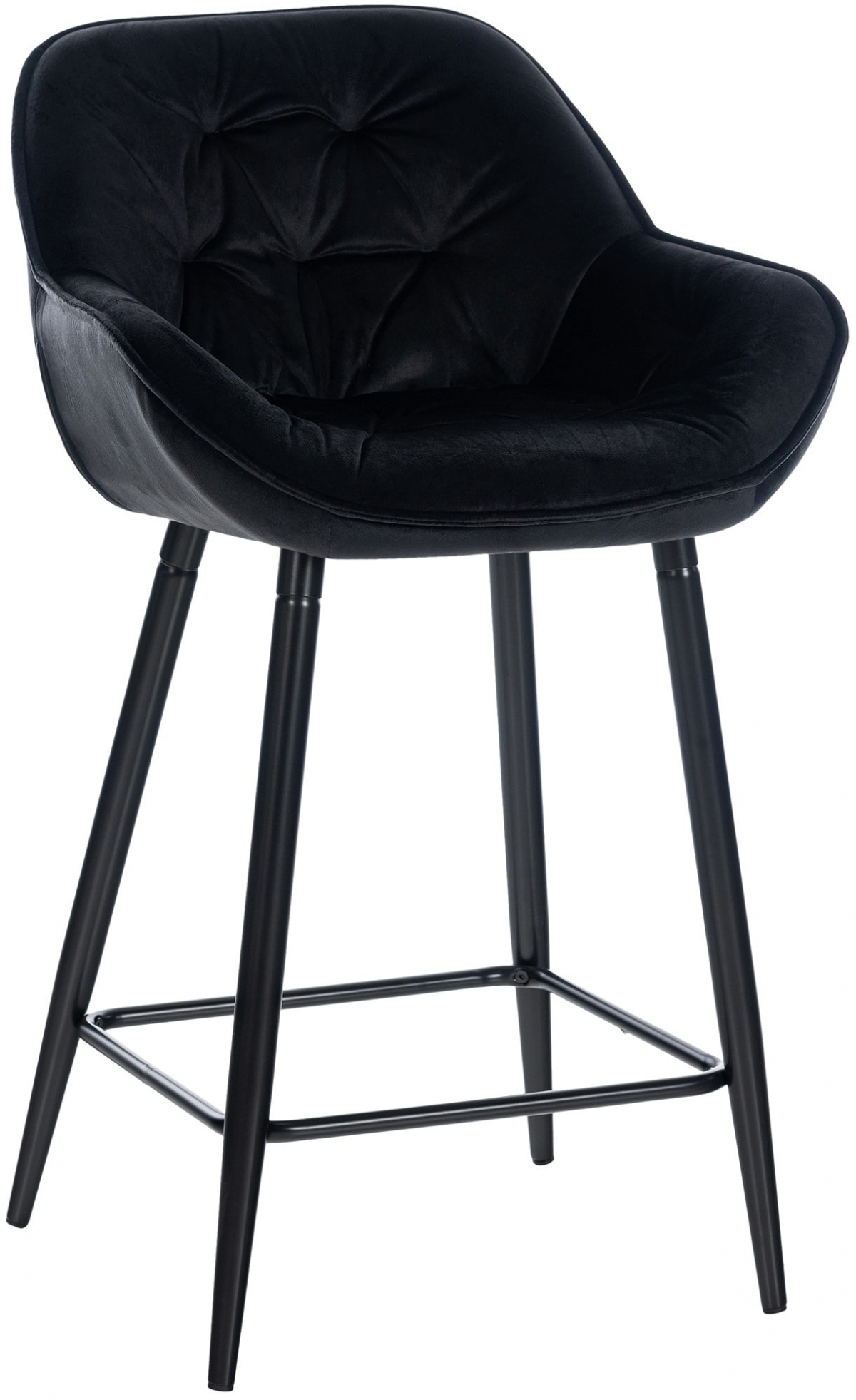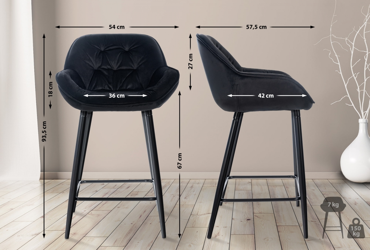Moderná barová stolička Gibson s elegantným čiernym kovovým rámom a zamatovým poťahom. Ponúka pohodlné polstrované sedadlo, operadlo a opierku nôh. Nosnosť až 150 kg, rozmery 93,5 x 54 x 57,5 cm.