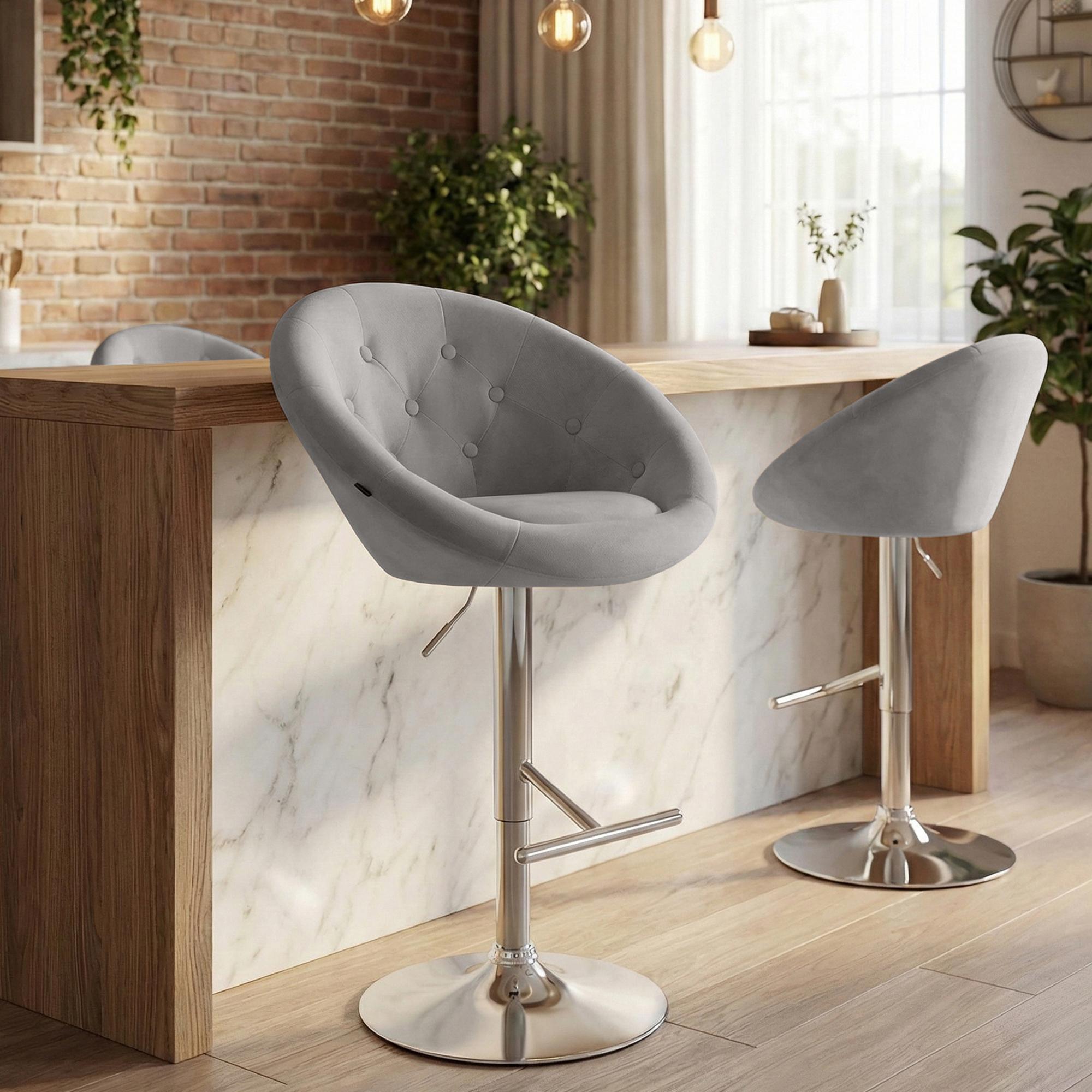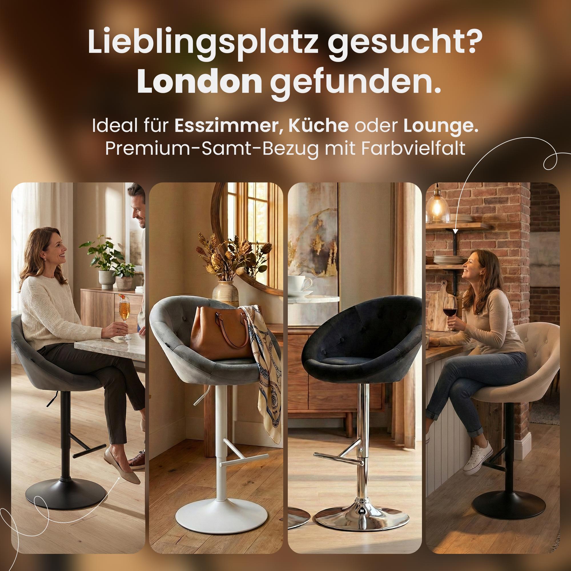 Barová stolička London kombinuje moderný dizajn s pohodlným zamatovým poťahom a stabilným kovovým rámom. Je výškovo nastaviteľná a otočná, ideálna pre každý bar.
