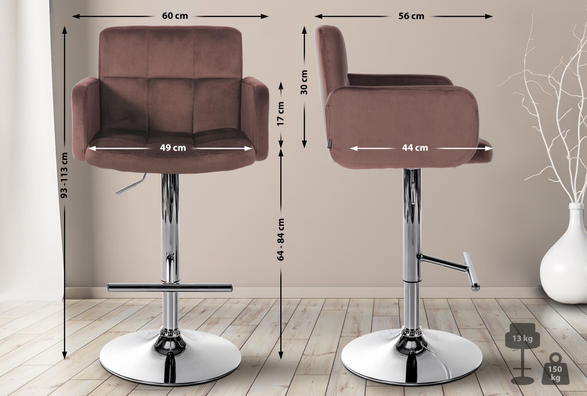 Luxusná barová stolička Los Angeles v zamatovom prevedení. Dizajnová a pohodlná, s nastaviteľnou výškou a otáčaním o 360°. Ideálna pre každodenné použitie v bare či kuchyni vďaka vysokému operadlu a lakťovým opierkam.