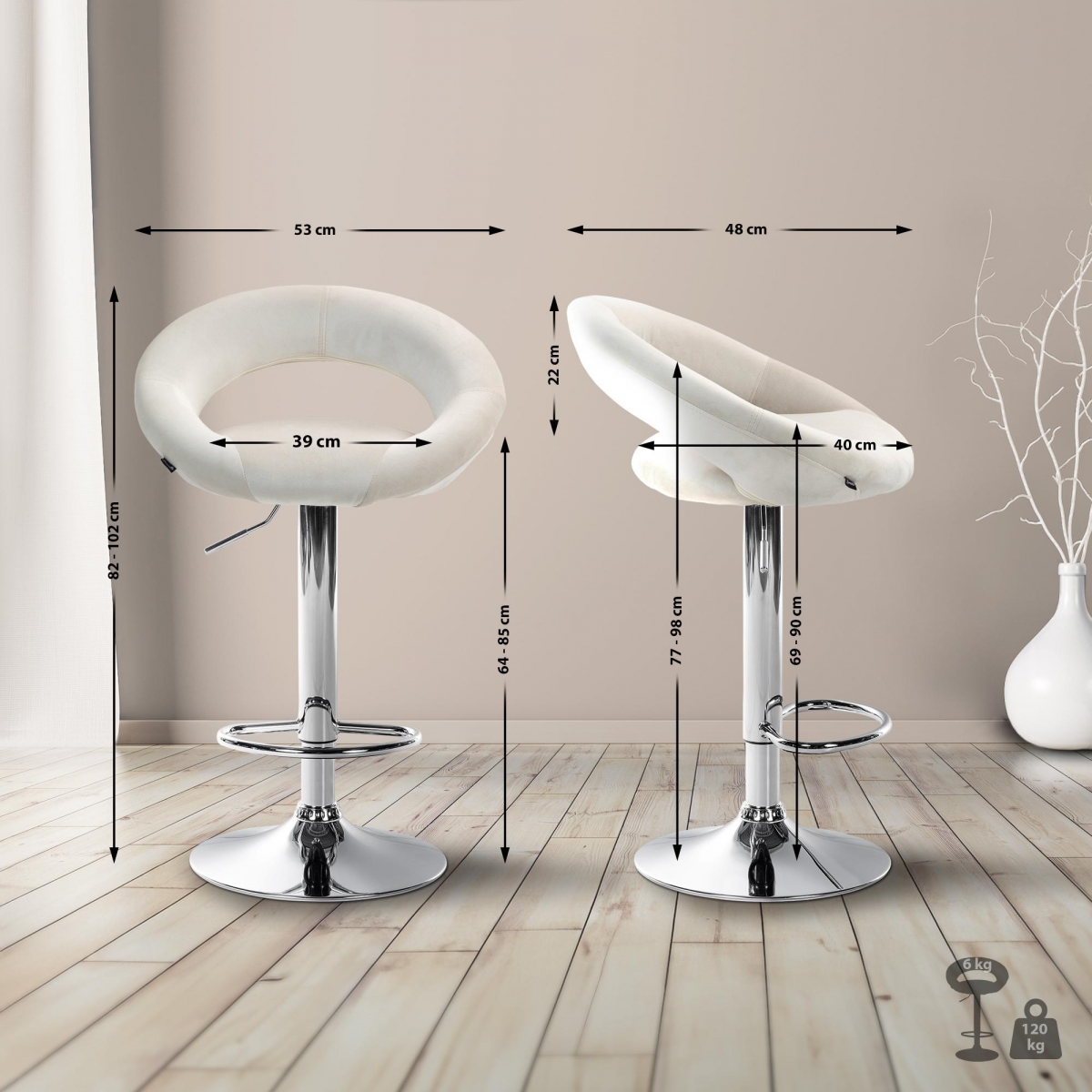 Barová stolička je plynule výškovo nastaviteľná, takže výšku sedadla je možné nastaviť medzi 60 a 81 cm. Vďaka tomu je stolička všestranná a vhodná na použitie pri rôznych výškach stolov alebo pultov.