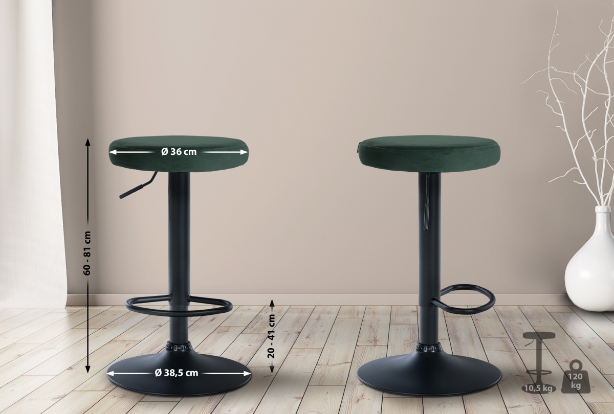 Luxusná barová stolička s otočným mechanizmom a nastaviteľnou výškou 60-81 cm. Ponúka pohodlné sedenie vďaka kvalitným materiálom, opierke nôh a maximálnej nosnosti 120 kg. Ideálna do kuchyne či baru.