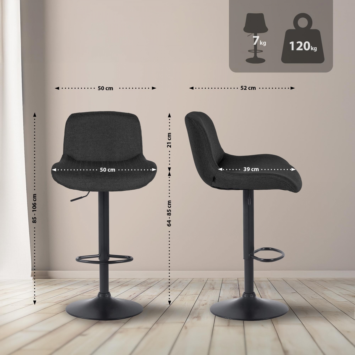 Matný čierny kovový rám taburetky a módny poťah dodávajú taburete elegantný vzhľad. Sedadlo je dostupné buď z odolnej látky, alebo z elegantného zamatu. Kovový rám je výškovo nastaviteľný a funkcia otáčania o 360 stupňov zaisťuje dostatok voľnosti pohybu.