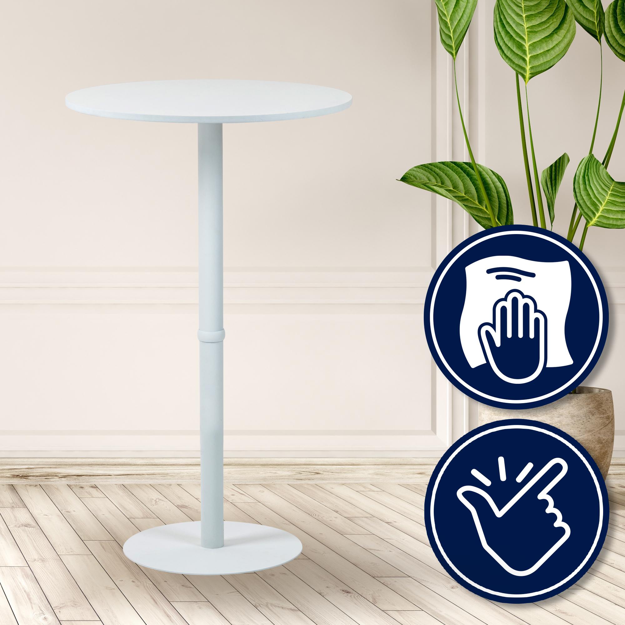 Vďaka ťažkej základnej doske je okrúhly stôl obzvlášť stabilný. S priemerom 60 alebo 75 cm ponúka doska stola priestor pre dve až štyri osoby. Výška barového stola je kompatibilná s mnohými štandardnými barovými stoličkami a doska stola unesie až 80 kilogramov.