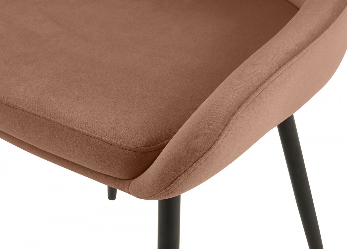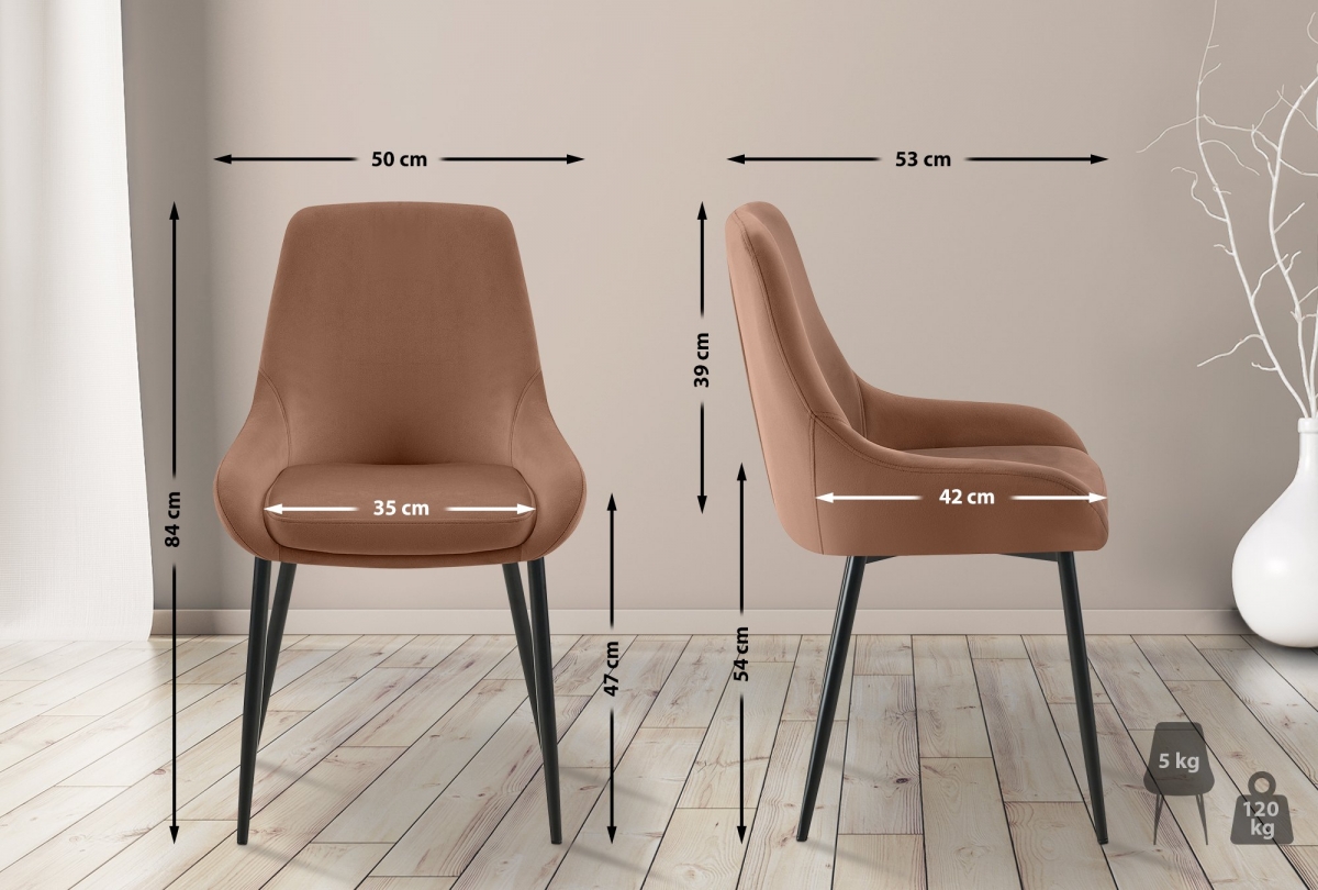 Jedálenská stolička Elmira s luxusným zamatovým poťahom ponúka štýlové a pohodlné sedenie do kuchyne či jedálne. Vďaka čalúnenému sedáku, opierke a kovovému rámu s nosnosťou 120 kg je ideálna pre dlhodobé sedenie.