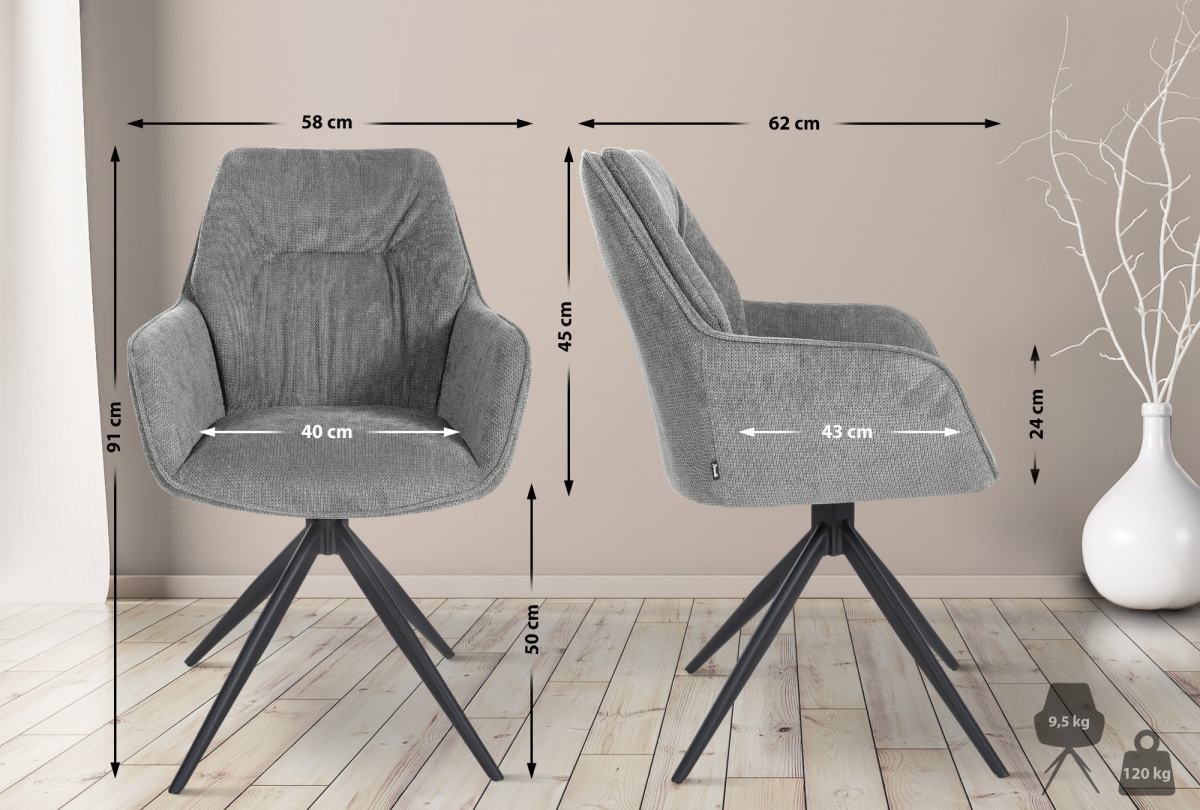 Jedálenská stolička Jules - moderný komfort s otočnou funkciou. Čalúnené sedadlo, operadlo a opierky rúk poskytujú pohodlie, zatiaľ čo robustný látkový poťah zaručuje jednoduchú údržbu. Dostupná v 7 farbách, s nosnosťou až 120 kg.