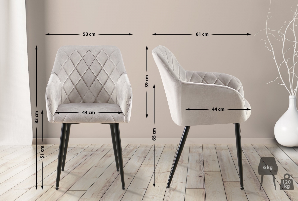 Elegantná jedálenská stolička Monett s luxusným zamatovým poťahom a prešívaným vzorom. Stabilný kovový rám, pohodlné čalúnenie a nosnosť až 120 kg z nej robia štýlový a praktický kúsok nábytku do kuchyne či jedálne.