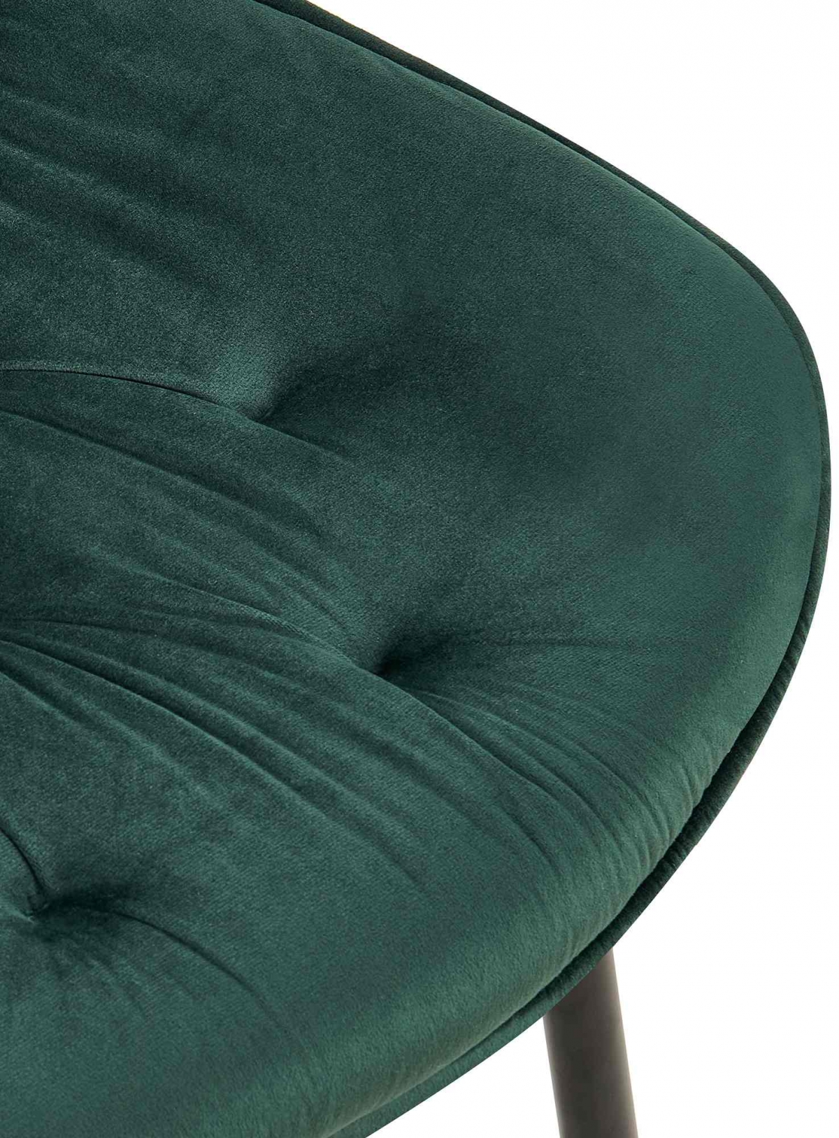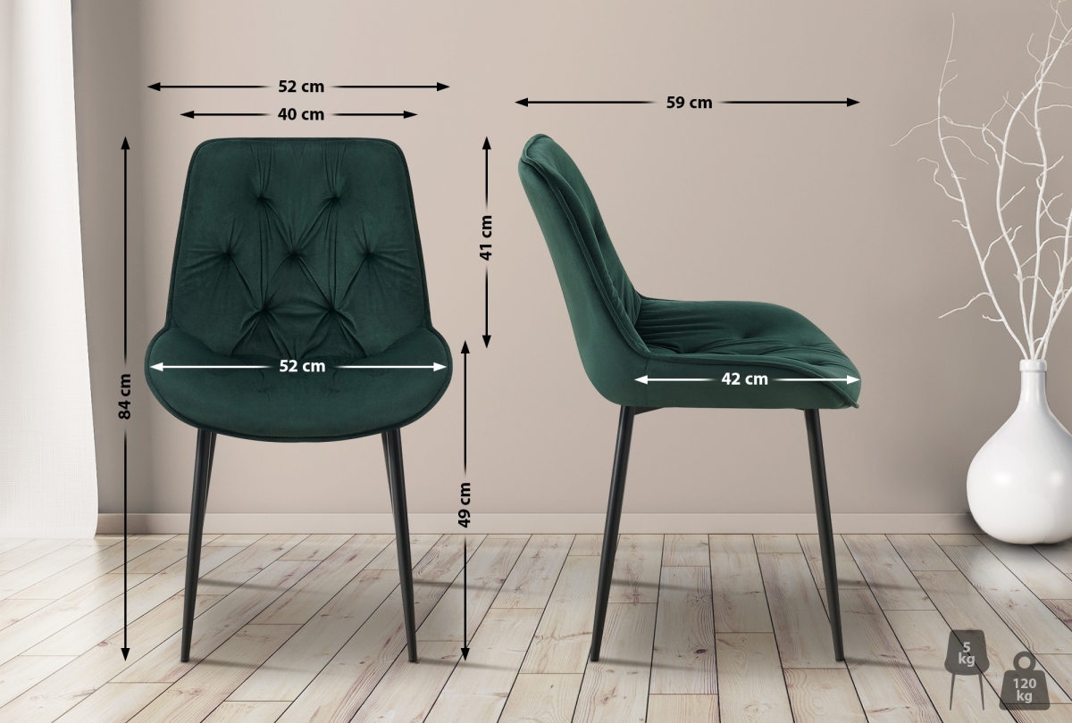 Jedálenská stolička Wallace spája vysoký komfort sedenia s moderným vzhľadom. Táto čalúnená stolička je skvelou voľbou k vášmu jedálenskému stolu, kuchyni, obývačke, ale aj na iné účely. Kľúčom k pohodlnému sedeniu je príjemné polstrovanie nad sedákom a operadlom. Sedačka má ľahko udržiavateľný zamatový poťah s módnym prešívaným vzorom. Základom tejto jedálenskej stoličky je stabilný čierny štvornohý rám vyrobený z pevného kovu. To znamená, že kuchynská stolička bezpečne udrží až 120 kg. Podlahové chrániče zabraňujú poškodeniu citlivých podláh.