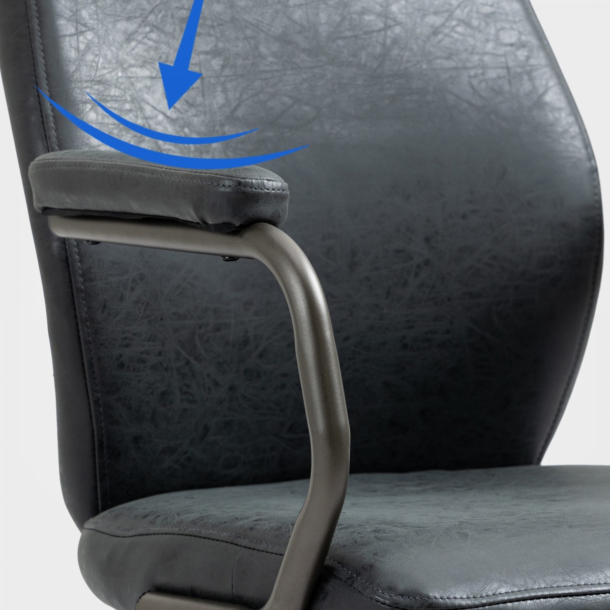 Kancelárske kreslo Natrona v priemyselnom štýle ponúka exkluzívny industriálny dizajn a maximálne pohodlie. Ergonomické sedenie zaisťuje nastaviteľná výška, hojdací mechanizmus a kvalitné polstrovanie z umelej kože. Stabilný kovový rám s kolieskami umožňuje ľahký pohyb.