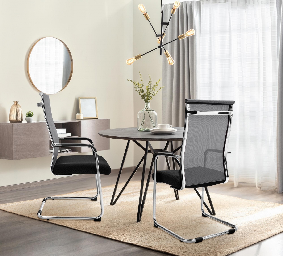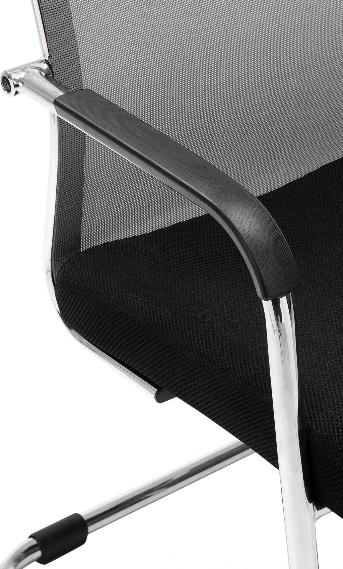 Elegantná konferenčná stolička s čalúneným sedadlom a sieťovaným operadlom na pochrómovanom ráme. Ideálna pre čakárne a veľtrhy, poskytuje priestoru exkluzívny vzhľad. Maximálna nosnosť 110 kg.