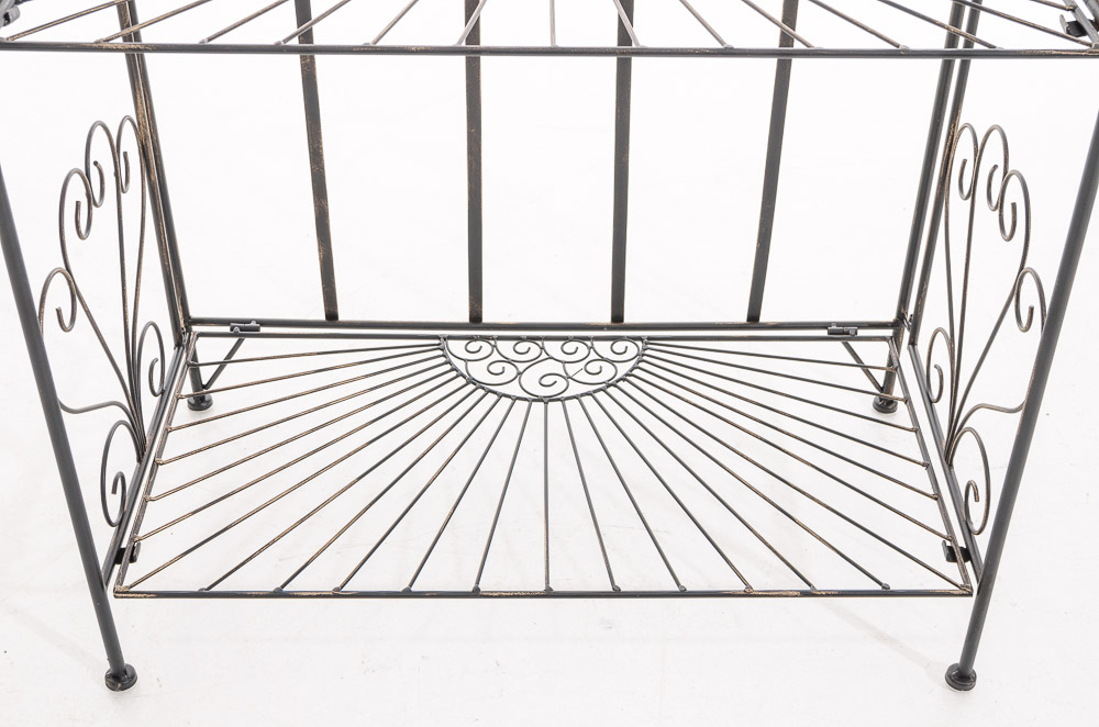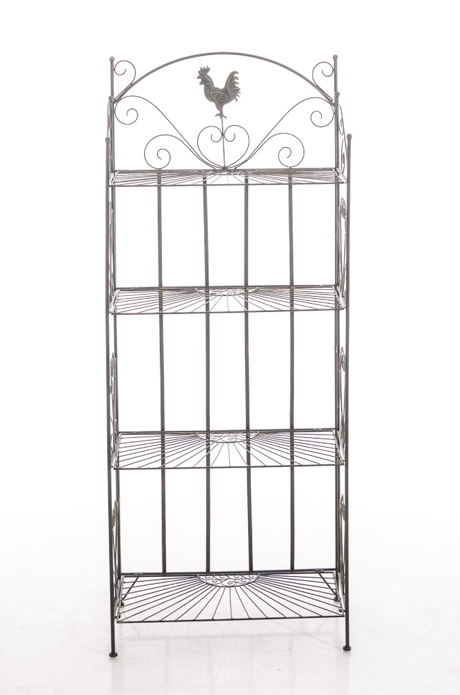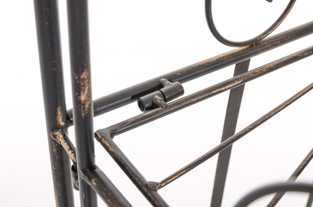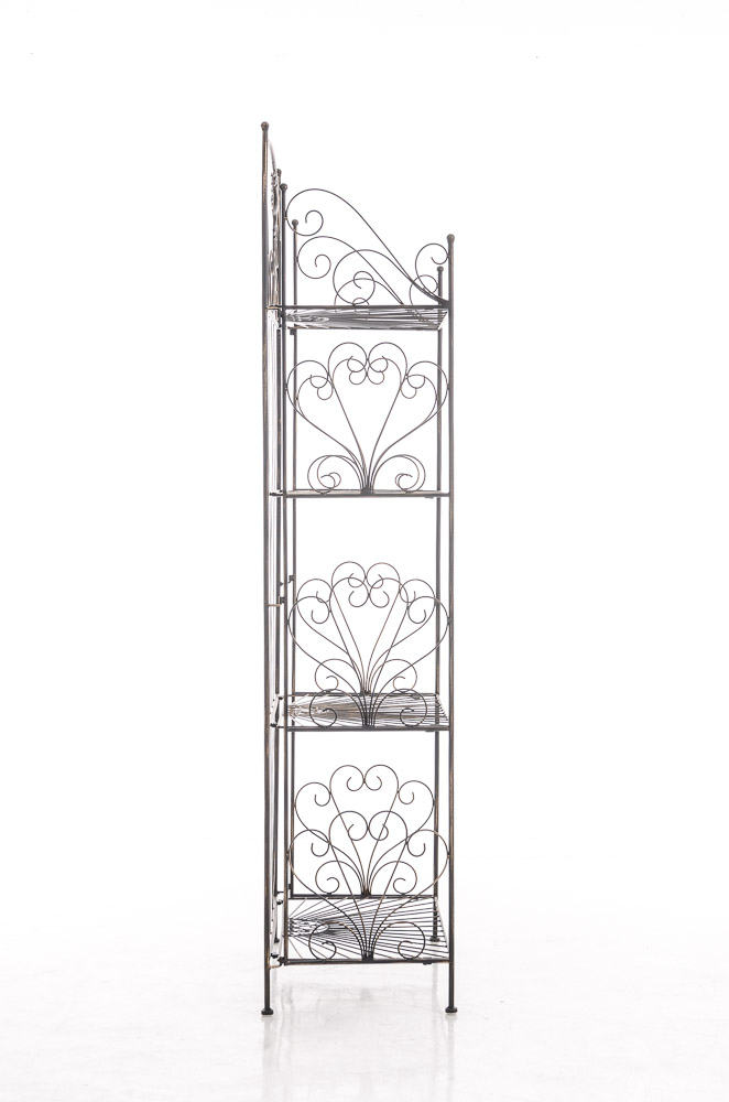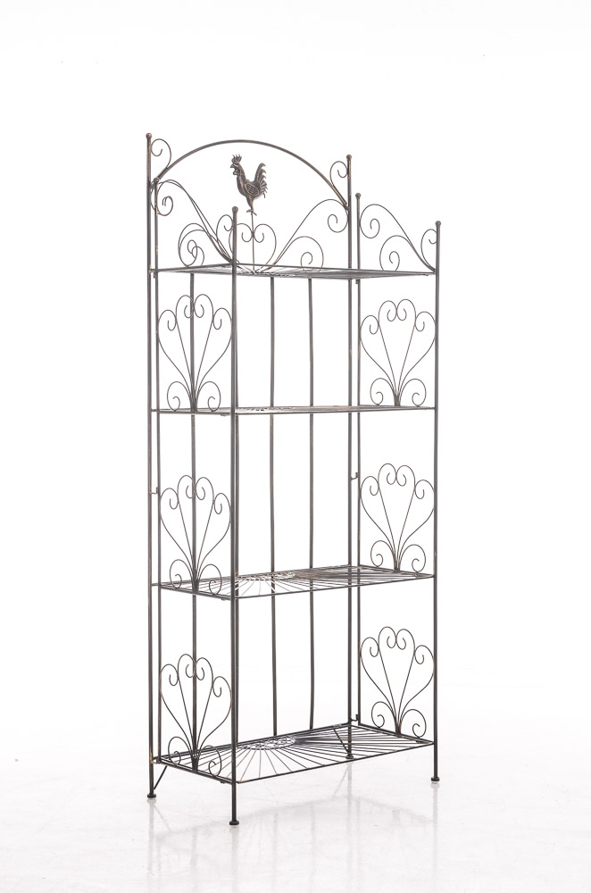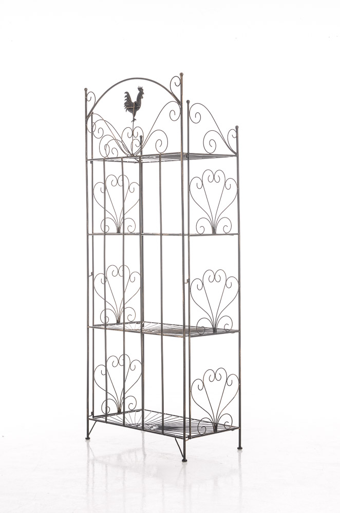 Robustná železná polica regál vo vidieckom štýle s kvalitným práškovým nástrekom. Stabilná konštrukcia s 4 policami a dekoratívnymi prvkami pre starobylý vzhľad. Rozmery: 61,5 x 33 x 153 cm, ľahko skladateľná.