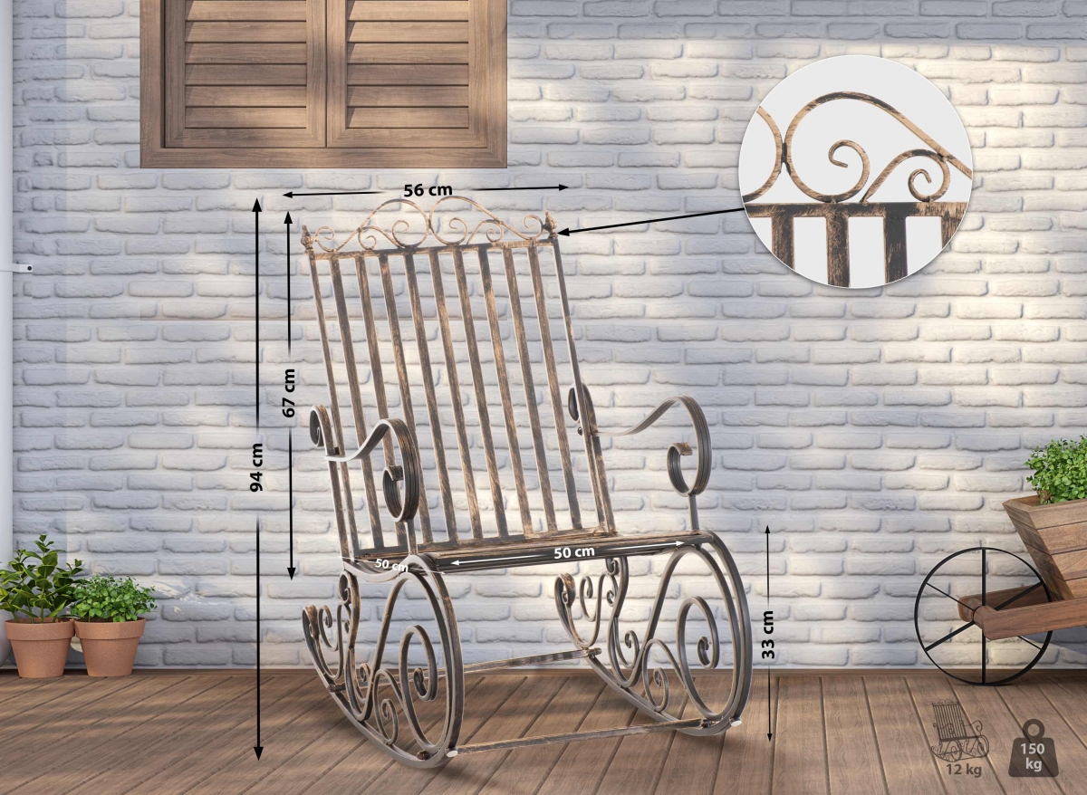Pohodlné a štýlové hojdacie kreslo s vysokými podrúčkami a operadlom pre príjemné sedenie. Ponúka jemný tvar, pekné detaily a pevnú konštrukciu s nosnosťou až 130 kg, rozmery 94 x 56 x 90 cm.