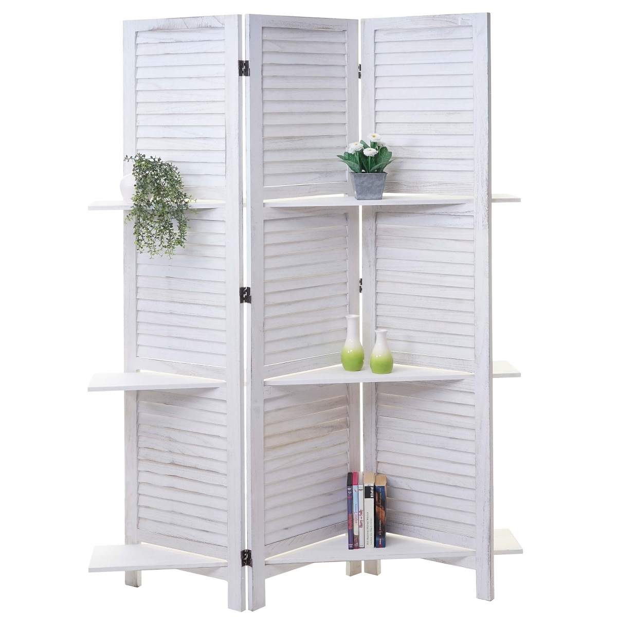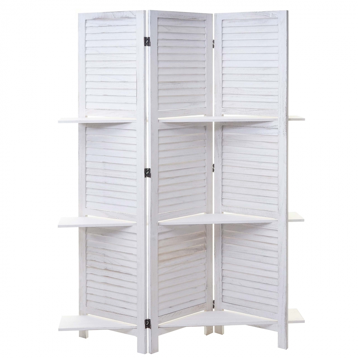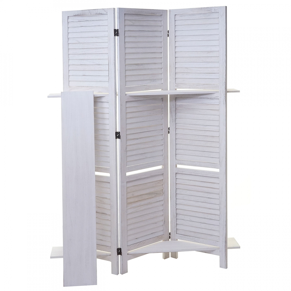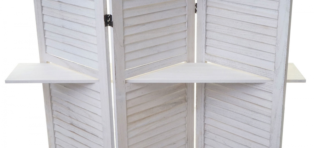 Skladací paraván z dreva paulovnia s 3 praktickými poličkami v shabby chic štýle. Rustikálny vzhľad s nádychom vintage, ideálny na dekoráciu a úložný priestor. Ľahký a stabilný, výška 170 cm, šírka 125 cm.