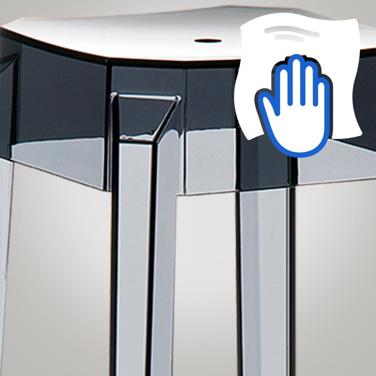 Stolička je kompletné vyrobená z vysoko lešteného Techno-polyméru PA6 nylon alebo priehľadného polykarbonátu.