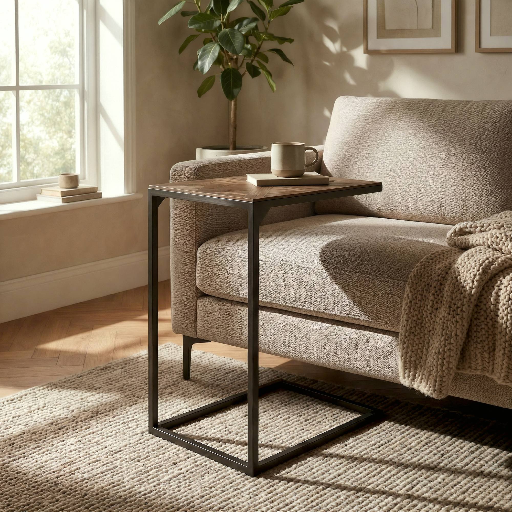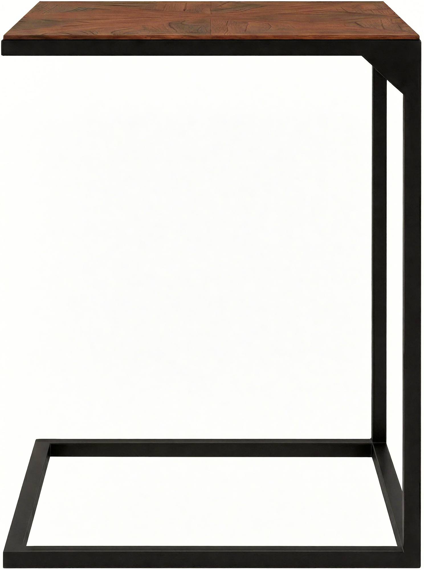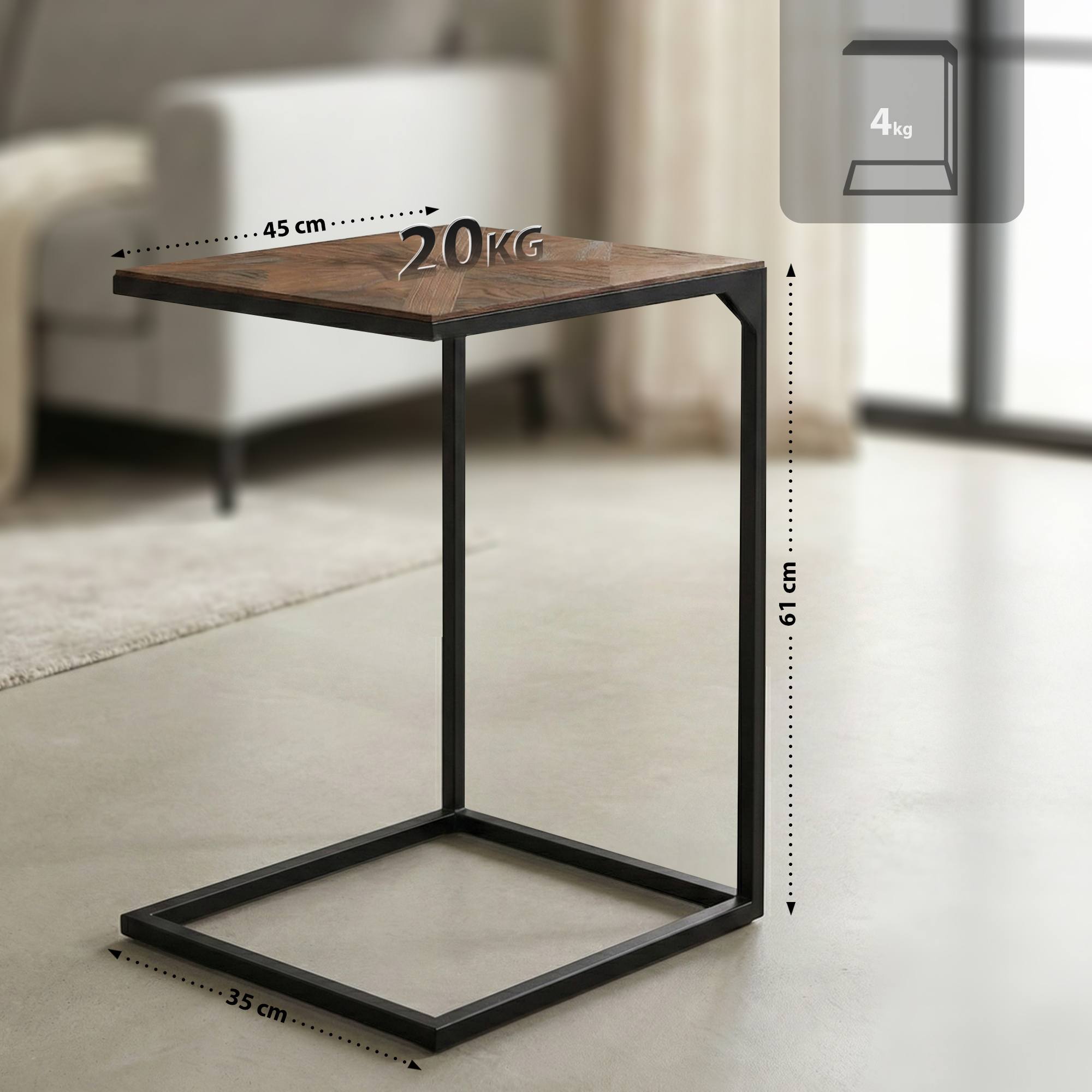 Rám z čierneho lakovaného železa poskytuje stabilnú konštrukciu a vytvára zredukovaný kontrast k drevenej doske. Vďaka C-tvaru je možné nohu stola zasunúť pod pohovku alebo kreslo, čím sa doska stola umiestni úsporne a dobre dostupne.