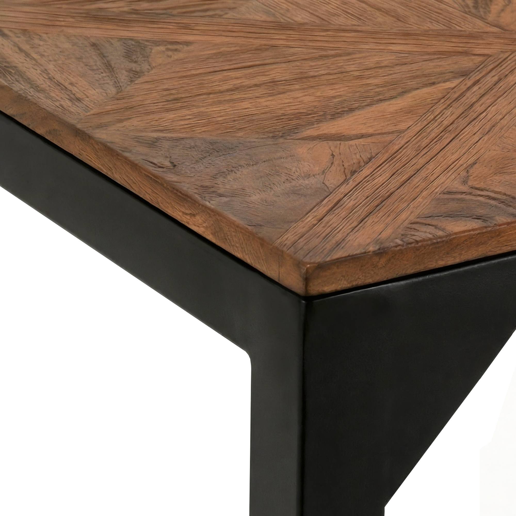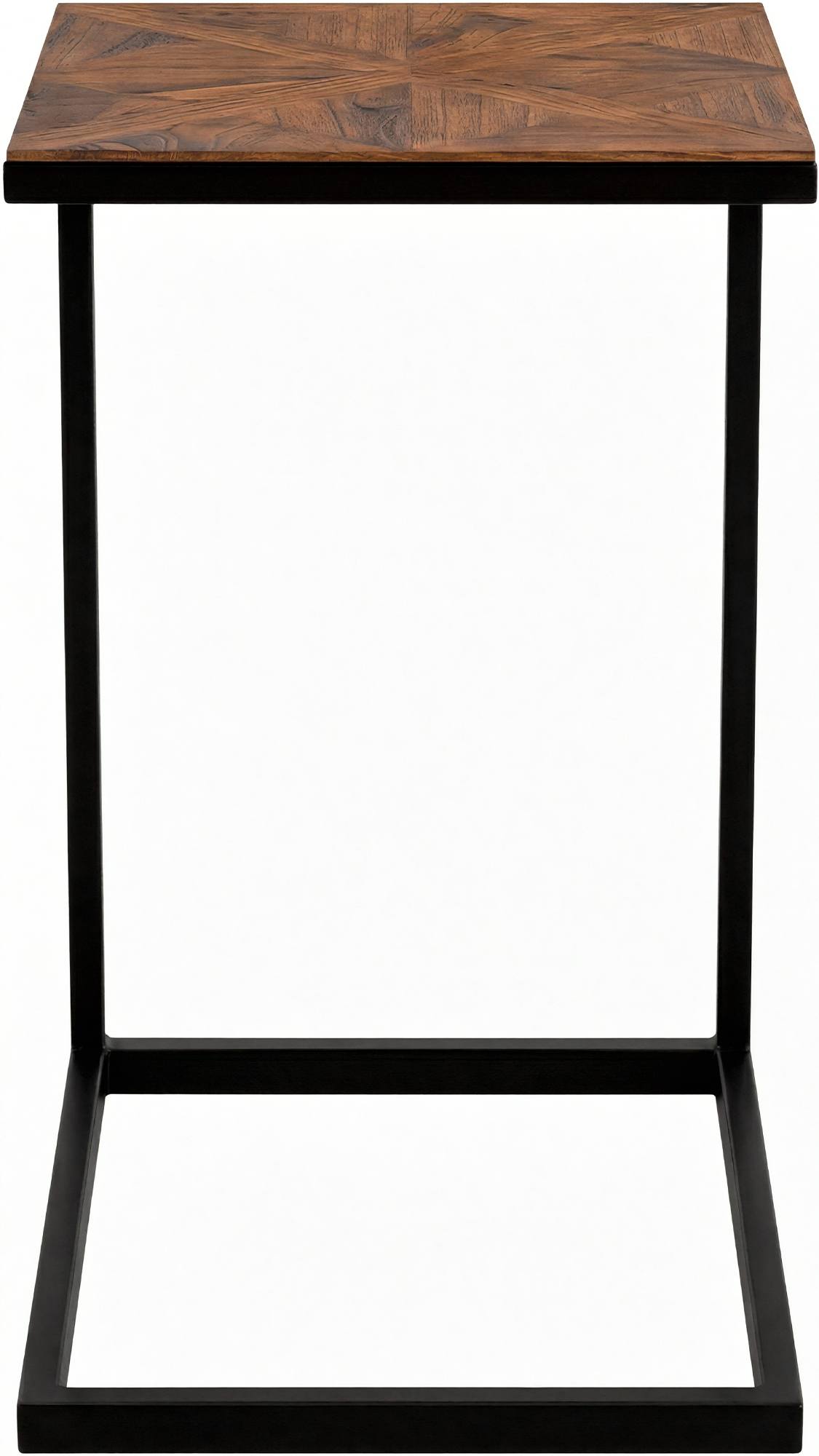 Príručný stolík Velaro kombinuje robustné drevo z mindi s stabilným, čierne lakovaným železným rámom. Ideálny do obývacej izby, poskytuje praktickú odkladaciu plochu na nápoje a knihy.