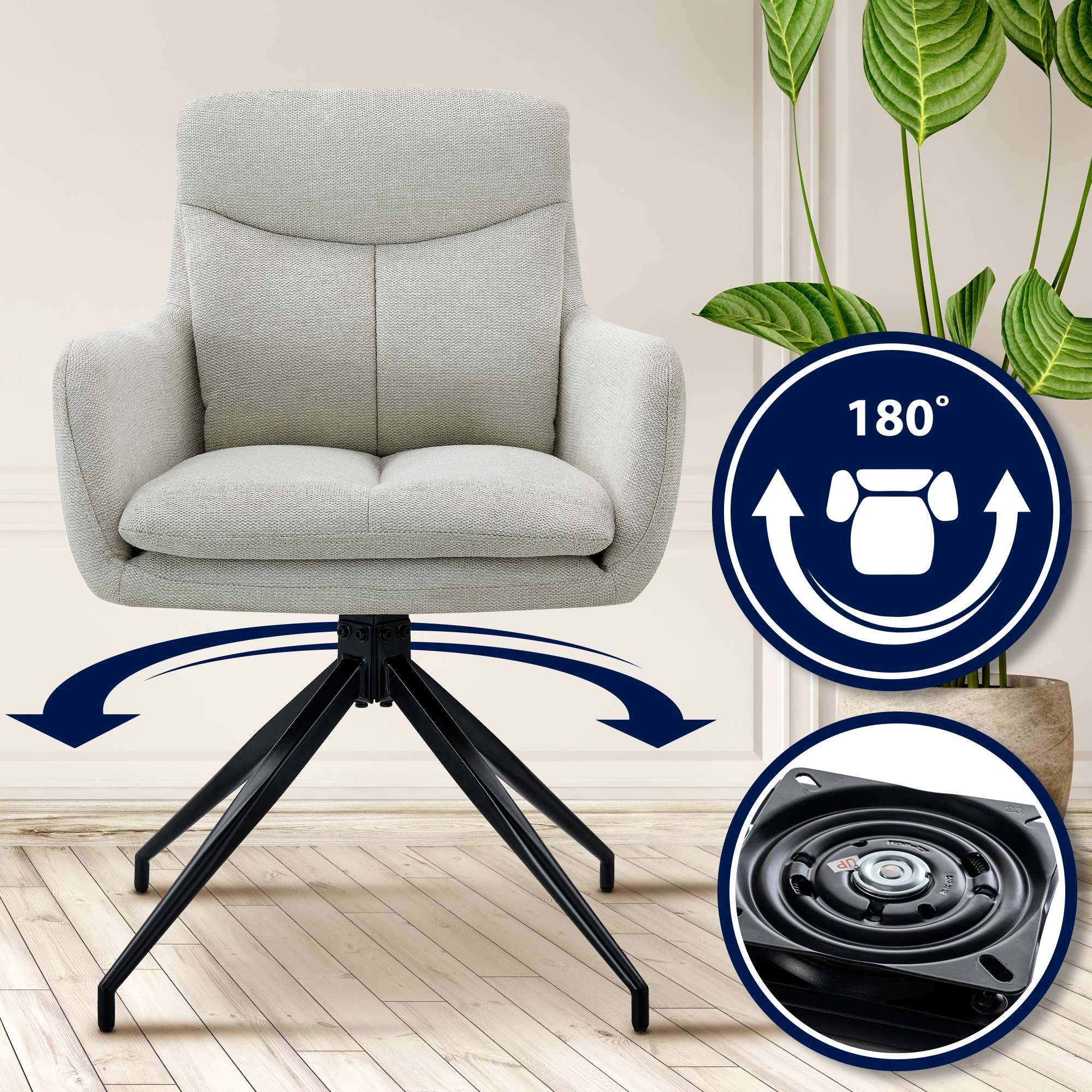 Pohodlné čalúnené sedadlo a ergonomicky tvarované operadlo a lakťové opierky podporujú uvoľnené, vzpriamené sedenie. Integrovaný otočný mechanizmus o 180° s robustnou kovovou základňou, funkciou automatického centrovania vratnými pružinami ponúka maximálnu voľnosť pohybu a jemne sa vracia do pôvodnej polohy pre pohodlné sedenie pri jedle, práci alebo oddychu.