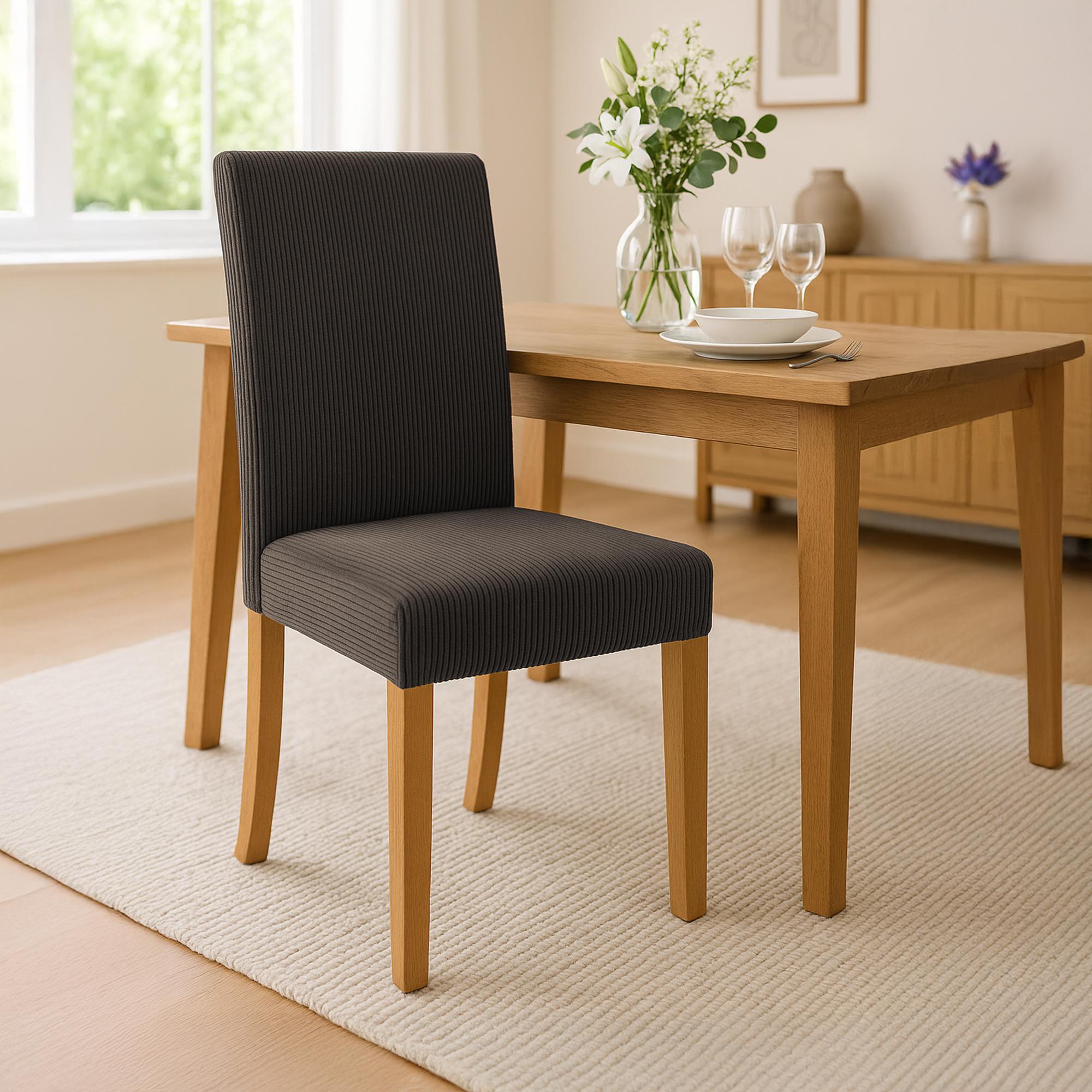 Jedálenské stoličky Ina v sade po dvoch kusoch ponúkajú vysoký komfort sedenia s elegantným poťahom z látky cord. Stabilný rám z kaučukového dreva zabezpečuje bezpečné postavenie a chráni podlahu.