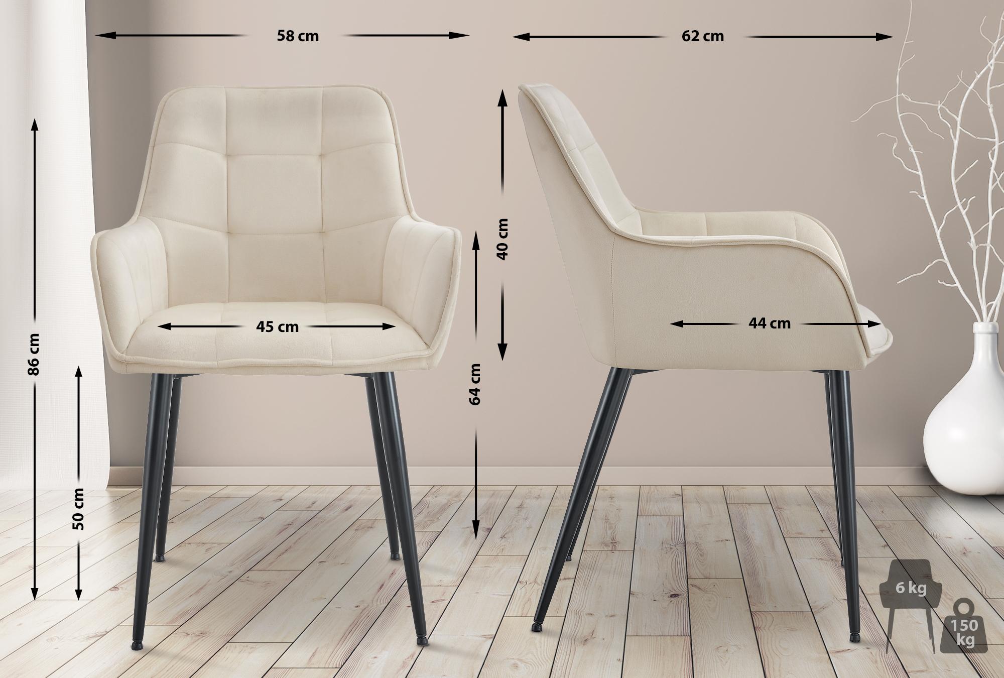 Moderná jedálenská stolička s pohodlným čalúneným sedadlom a podrúčkami. Zamatové čalúnenie a kovový rám s nosnosťou 150 kg zaručujú štýl a odolnosť. Ideálna do jedálne, spálne alebo ako stolička na čítanie - ergonomický tvar pre dlhšie sedenie.