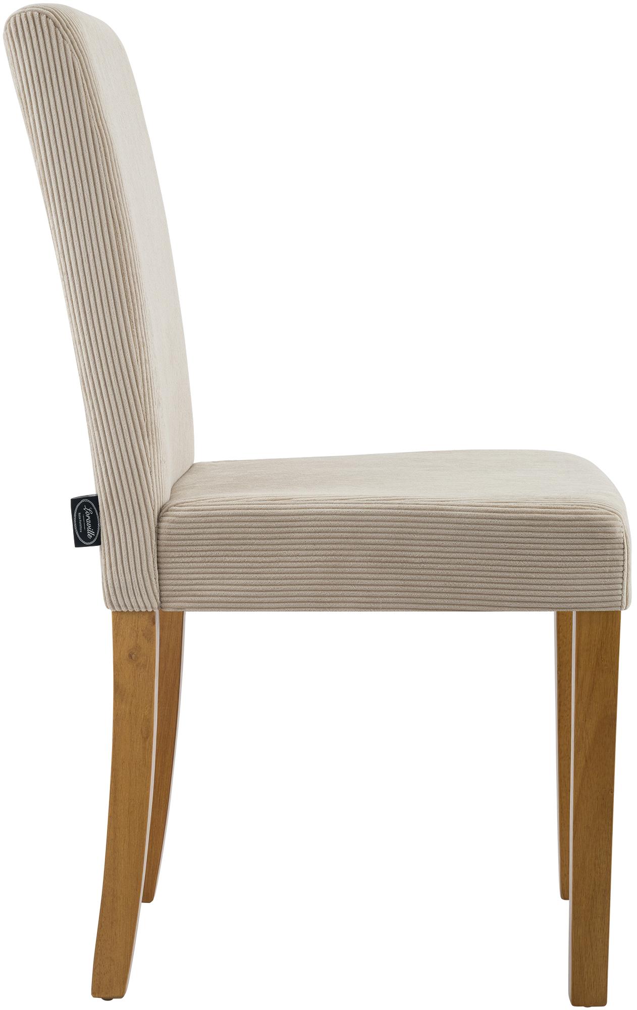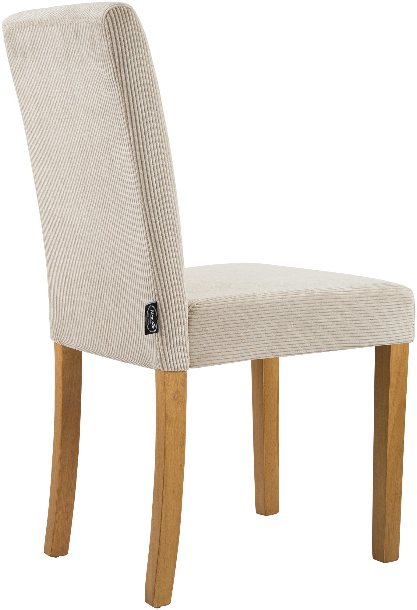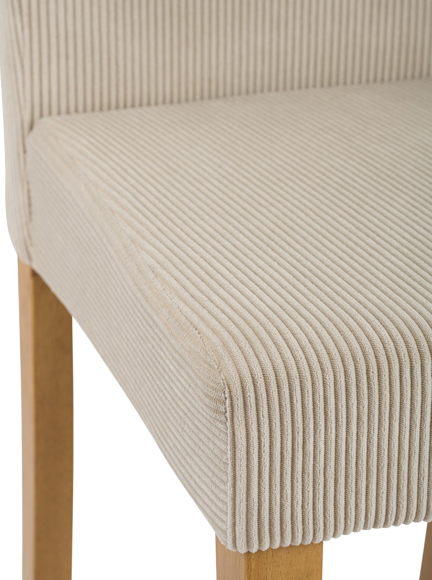 Jedálenské stoličky Ina v sade po dvoch kusoch ponúkajú vysoký komfort sedenia s elegantným poťahom z látky cord. Stabilný rám z kaučukového dreva zabezpečuje bezpečné postavenie a chráni podlahu.
