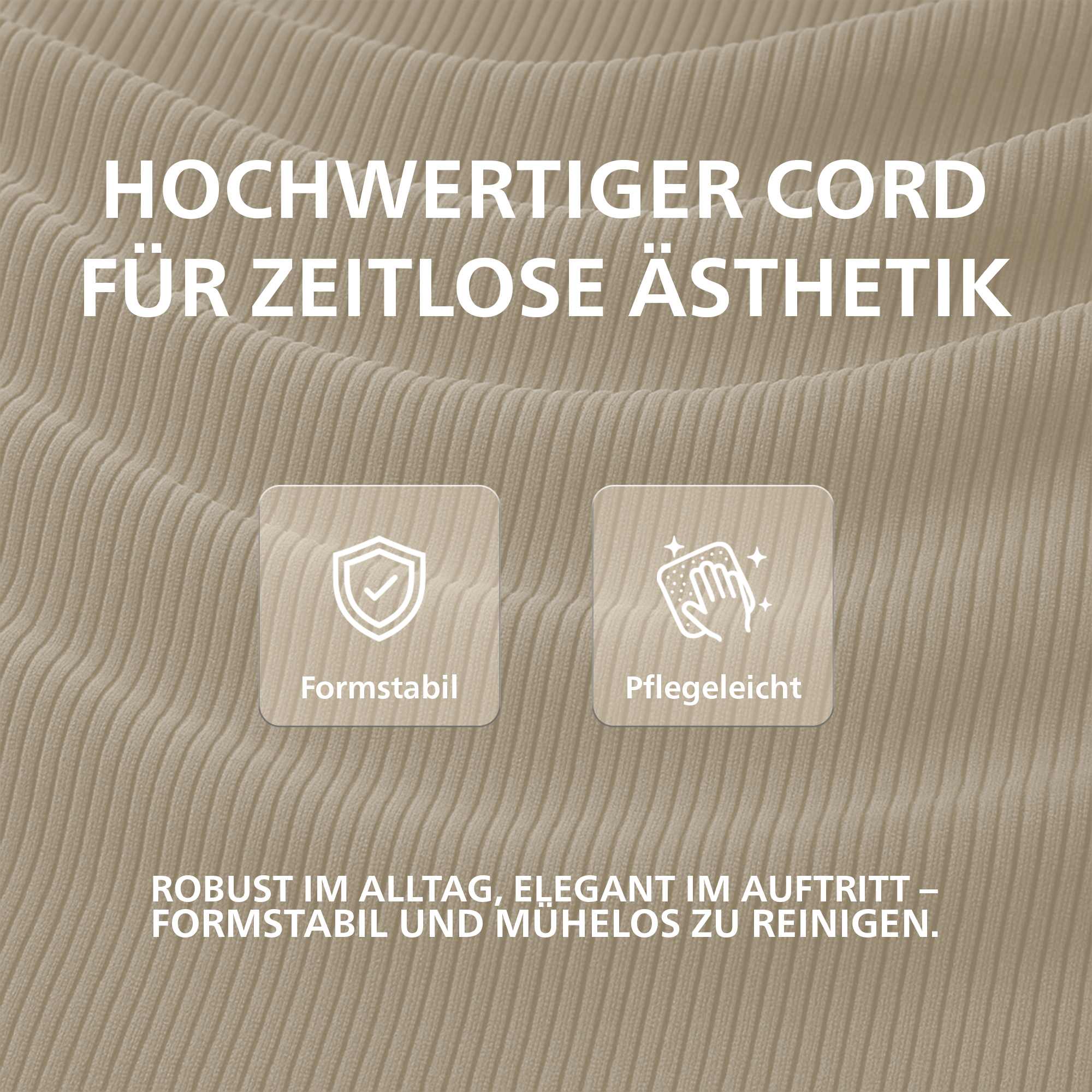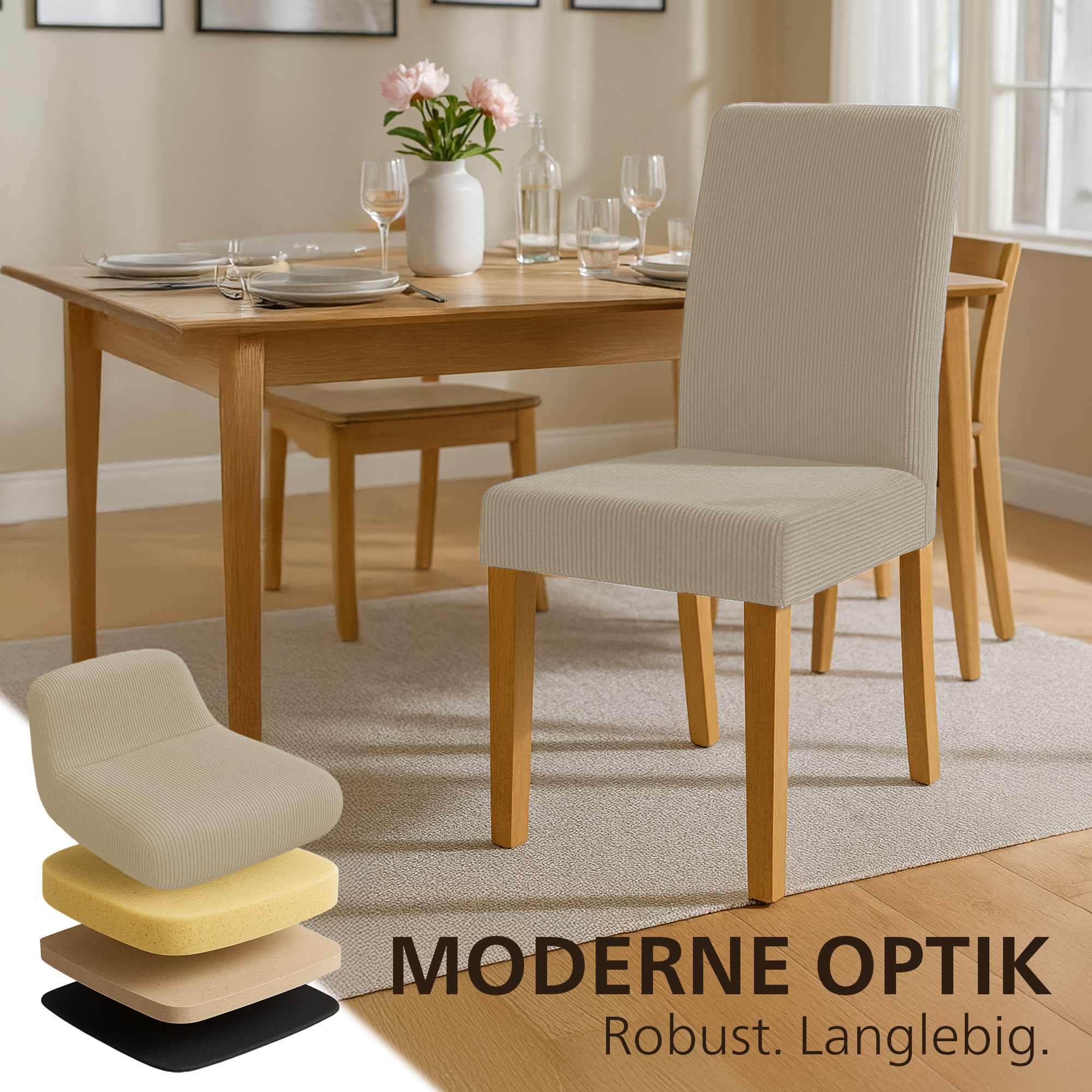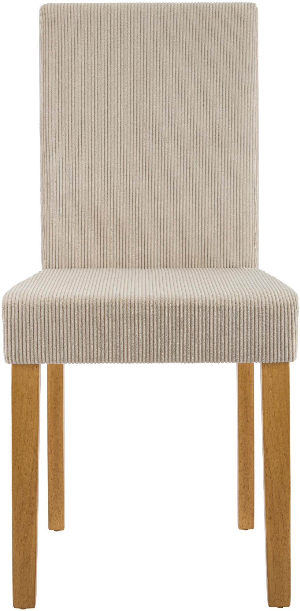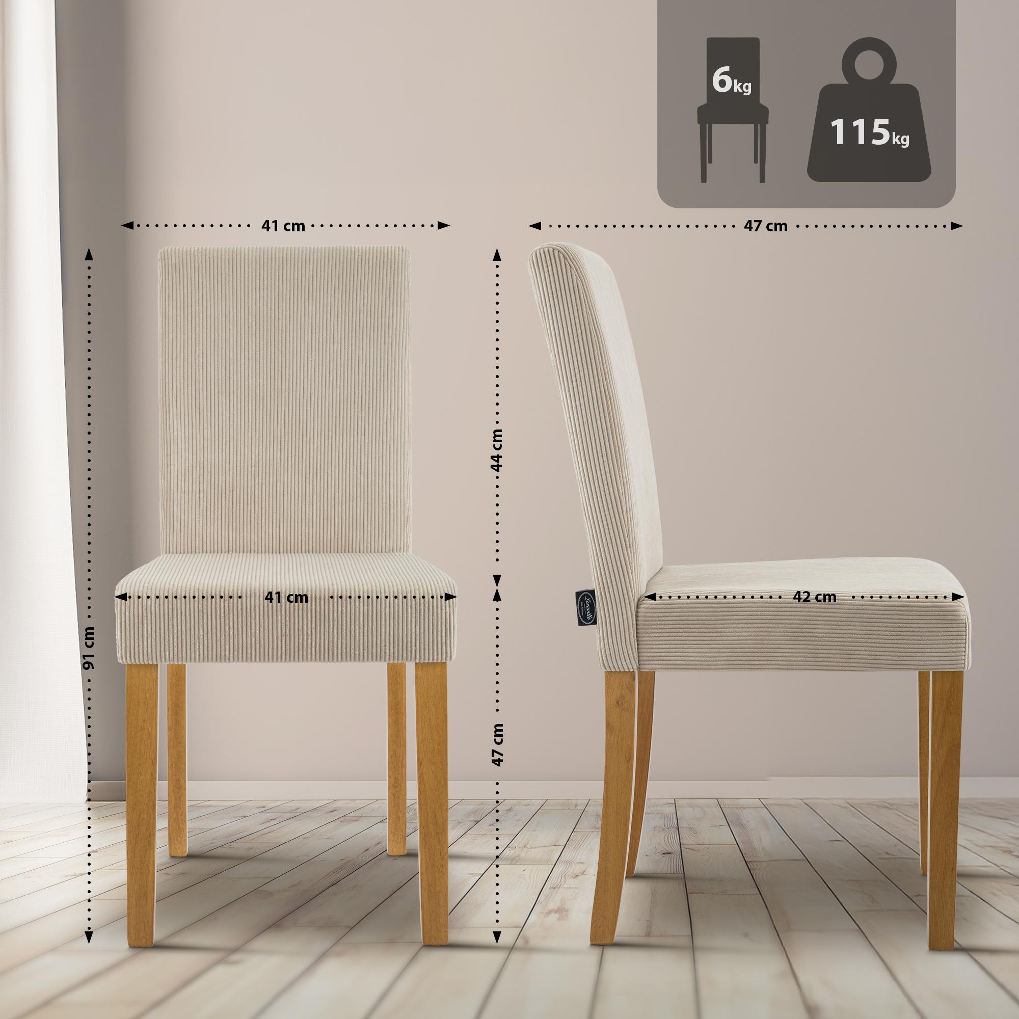 Jedálenské stoličky Ina v sade po dvoch kusoch ponúkajú vysoký komfort sedenia s elegantným poťahom z látky cord. Stabilný rám z kaučukového dreva zabezpečuje bezpečné postavenie a chráni podlahu.