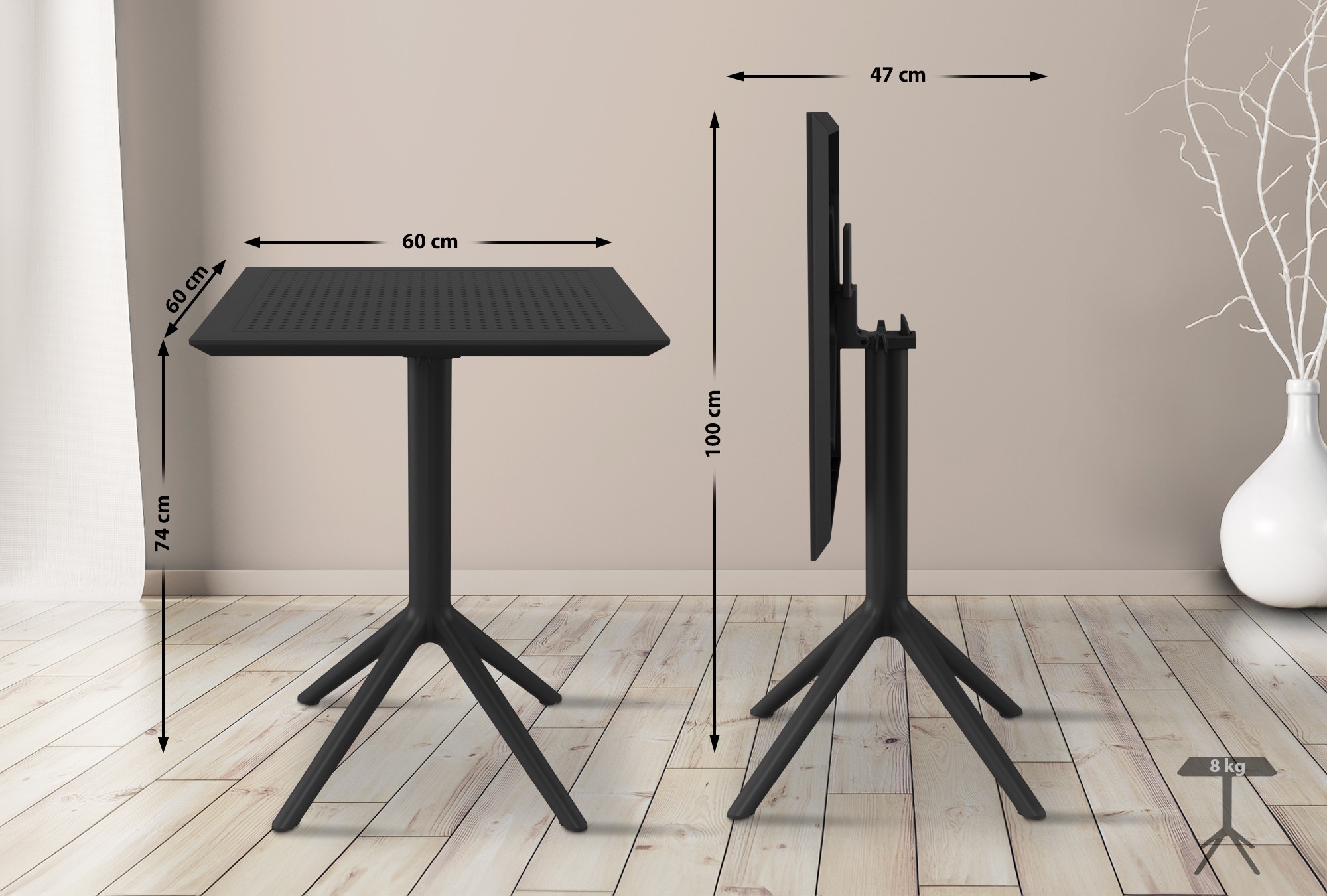 Ľahký skladací stôl Sky s UV odolným povrchom pre interiér aj exteriér. Vhodný ako bistro stôl alebo na terasu, s výberom okrúhlej alebo štvorcovej dosky 60 cm. Praktický na podujatia vďaka jednoduchému skladaniu.