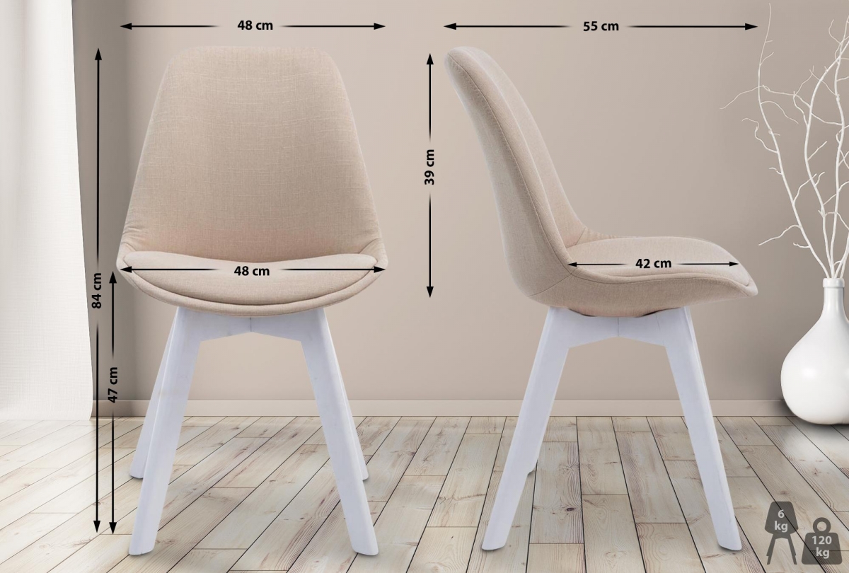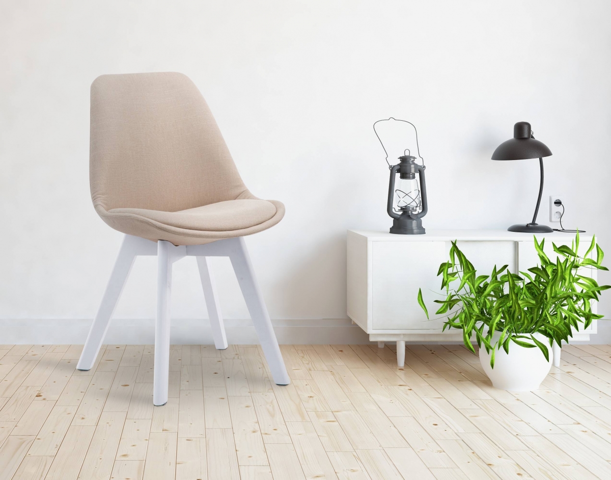 Škrupina sedadla je vyrobená z odolného plastu. Príjemné čalúnenie s látkovým poťahom poskytuje pohodlné sedenie. 4-nohá základňa z dreva prináša teplo a eleganciu.