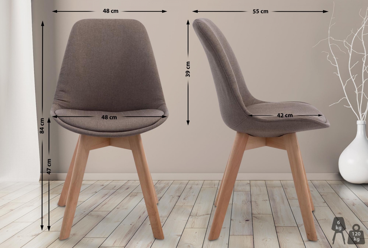 Škrupina sedadla je vyrobená z odolného plastu. Príjemné čalúnenie s látkovým poťahom poskytuje pohodlné sedenie. 4-nohá základňa z dreva prináša teplo a eleganciu.
