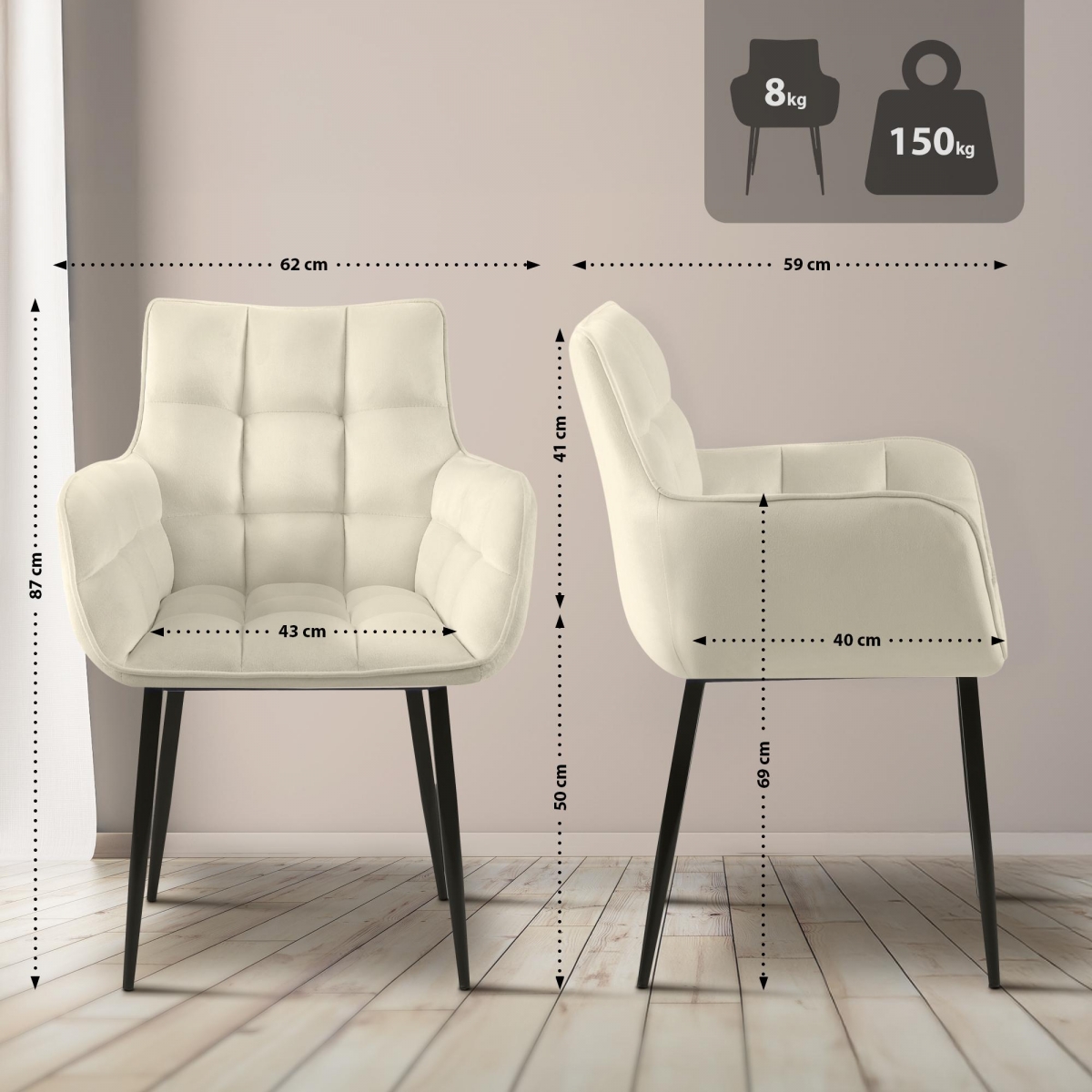 Kľúčom k pohodlnému sedeniu je príjemné polstrovanie na sedáku, operadle a opierkach rúk. Sedák a operadlo sú celé pokryté zamatom. Kockovaný prešívaný vzor vytvára elegantný vzhľad.