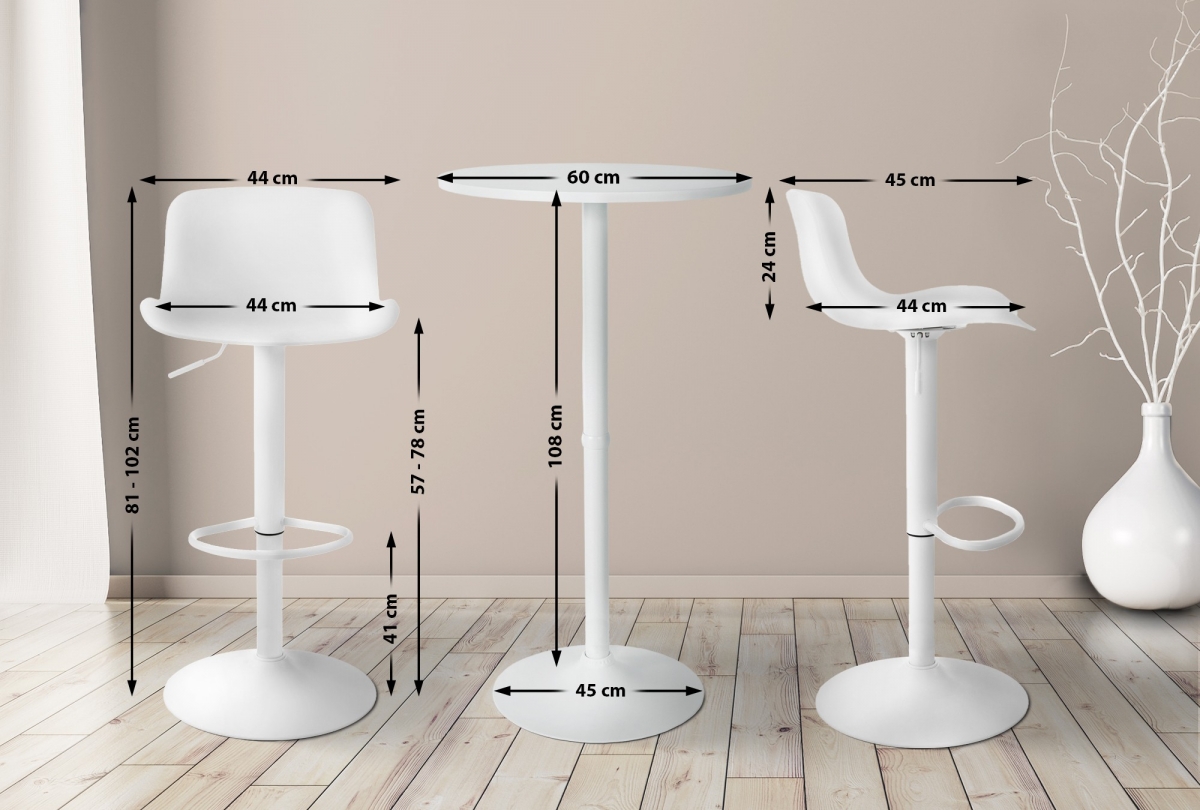 Sada 2 barových stolíkov Medora - moderný dizajn pre váš interiér. Okrúhly stôl a výškovo nastaviteľné stoličky z polypropylénu ponúkajú pohodlie a jednoduchú údržbu. Stabilný kovový rám v čiernej alebo bielej farbe dodáva eleganciu kuchyni či obývačke.