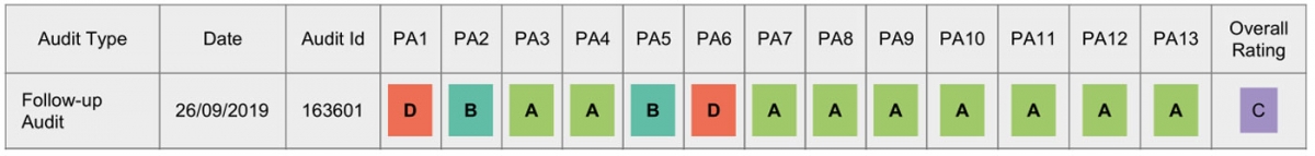Spoločenský manažment systém (PA1 = známka D), ochrana zamestnancov (PA2 = B), právo na kolektívne vyjednávanie/slobodu združovania (PA3 = A), žiadna diskriminácia (PA4 = A), primeraná odmena (PA5 = B), primeraná pracovná doba (PA6 = D), bezpečnosť a ochrana zdravia pri práci (PA7 = A), žiadna detská práca (PA8 = A), ochrana mladistvých (PA9 = A), žiadne fiktívne zamestnanie (PA10 = A), nútená práca (PA11 = A), ochrana životného prostredia (PA12 = A), etické obchodné správanie (PA13 = A)