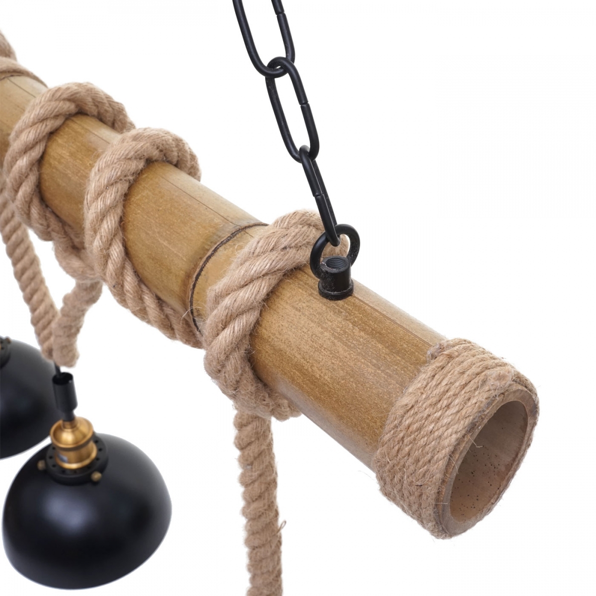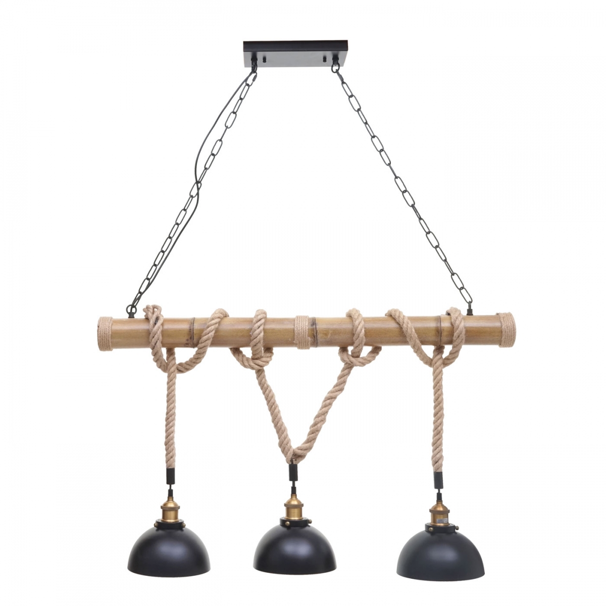 Štýlové stropné svietidlo s 3 tienidlami v industriálnom štýle. Kombinácia bambusu, kovu a konopného lana vytvára extravagantný vzhľad. Trendy závesné svietidlo s teplou farbou pre atraktívne osvetlenie interiéru.